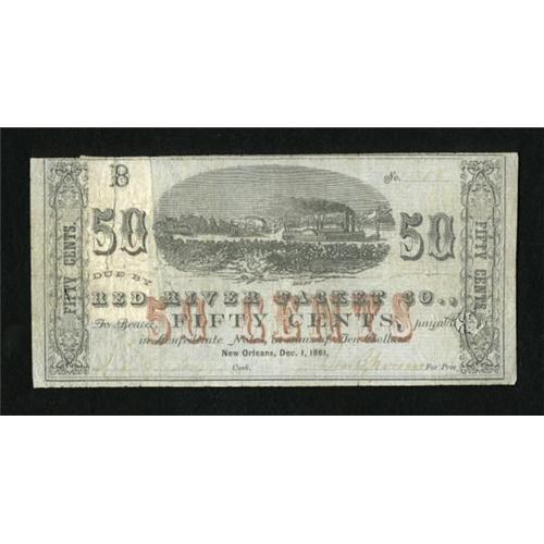 <B>New Orleans, LA- Red River Packet Co. </B></I>50c Dec. 1, 1861<BR> We have handled only one other example of this fractional denomination. This piece is far nicer, despite a noted repair in the design at right. <B>Fine.</B></I><BR><I>From The Collection of a Louisiana Gentleman</B></I><BR><BR><b>Shipping:</b> Coins & Currency (<a target="_blank" href="http://www.heritageauctions.com/common/shipping.php">view shipping information</a>)