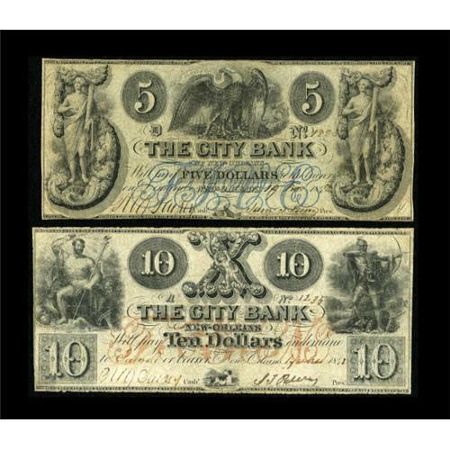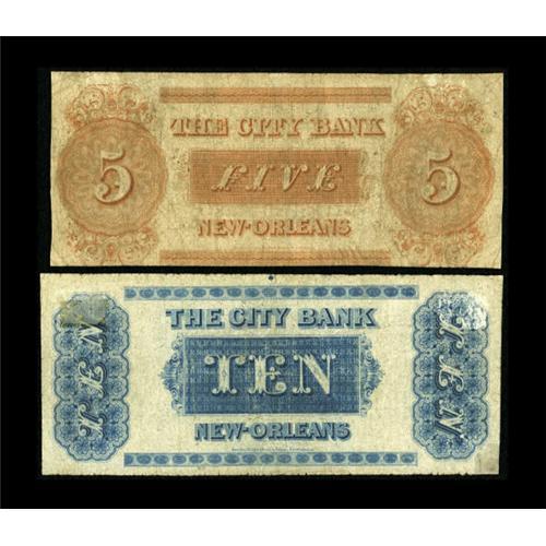 <B>New Orleans, LA- The City Bank</B></I> $5, $10 G14b, G26b<BR> Two pieces from this very tough bank, the $5 <B>Fine,</B></I> the $10 <B>Fine</B></I> but with some minor repairs. <BR><I>From The Collection of a Louisiana Gentleman.</B></I><BR><BR><b>Shipping:</b> Coins & Currency (<a target="_blank" href="http://www.heritageauctions.com/common/shipping.php">view shipping information</a>)