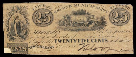 New Orleans, Louisiana, 1837, 25 cents, Unlisted, issued scrip note, similar to 1837 issue but the wavy title ÒNew-Orleans on the lower left middle is longer, cattle and sheep in middle, standing allegorical woman on left, small pin holes due to ink burn, Good+ to VG, small repair on LR corner otherwise scarce early New Orleans, Obsolete scrip note.