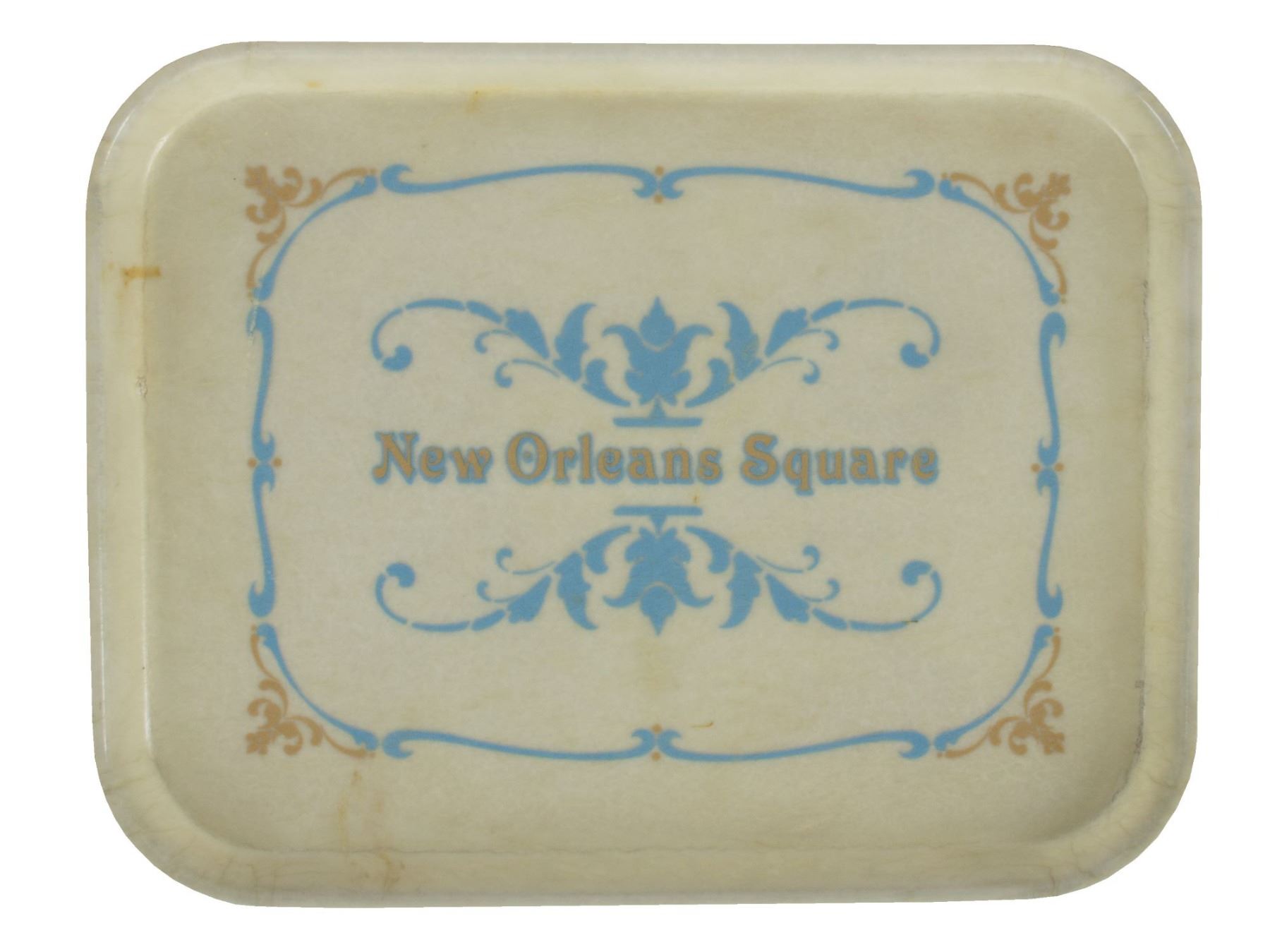 (Disneyland, c.1960s) A large food service tray from Disneyland's "French Market" area within New Orleans Square. The tray reads "New Orleans Square" within a decorative border in blue and gold tones. The tray measures 14"x18" and is in fair to good condition with wear throughout from use including scuffing and small spots of discoloration.