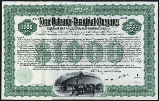 Louisiana, 19xx, $1000, 4% Registered 1st Mortgage 50 Year Gold Specimen Bond, Black on green border and underprint, Vignette of locomotive leaving station bottom center, Blue SPECIMEN overprint POC's and blue s/n Ò00000Ó, VF-XF condition, FLBNC. Bond in this denomination and color not found in the Cox Catalogue.