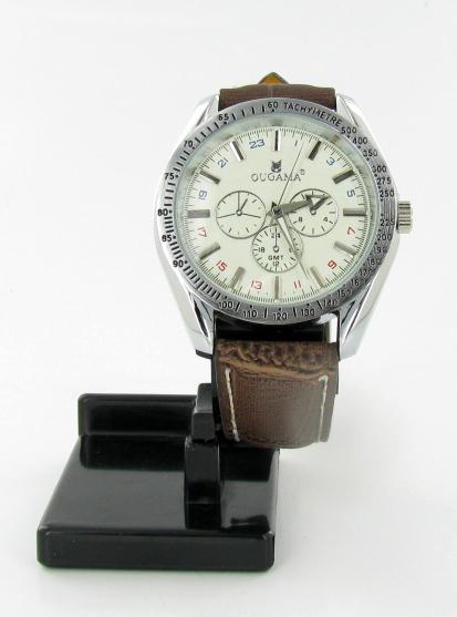 Brand New Ougama men's stylish sport CHRONOGRAPH style watch in excellent new condition with 12-hour, 24-hour and tachy dials; stainless oversized case and leather band; box and spare battery; retail $1295