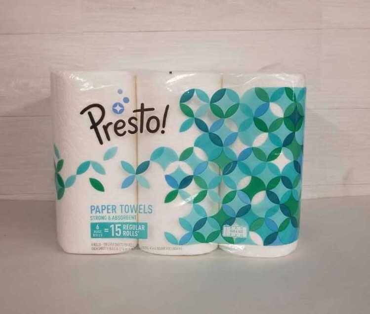 This lot is for 6 rolls of Presto paper towels. 6 huge rolls = 15 regular rolls. Each roll has 158 2-ply sheets per roll. Each sheet is 11 in x 6 in (27.9 CM by 15.2 cm) / Total 434.5 Square Feet. Condition: New, sealed.