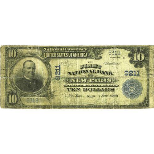 <B>New Paris, OH</B></I> - $10 1902 Plain Back Fr. 626 <B>The First NB</B></I> Ch. # 9211<BR>This <B>Very Good</B></I> $10 Plain Back comes from one of the 12 communities in the state to include "New" in their town name. While quite well circulated and with paper that has become a bit on the soft side, it remains fully intact and comes from the sole issuer in town, an institution whose known population still includes just two $10 Plain Backs and it is, in addition, only the sixth large size note from here total. Plan to keep your bidder card raised for a few more jumps than anticipated in order to add this elusive bank to your collection.