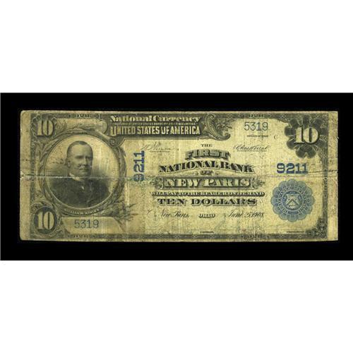 <B>New Paris, OH</B></I> - $10 1902 Plain Back Fr. 626 <B>The First NB</B></I> Ch. # 9211<BR>The census from this scarce issuer includes just six large notes, three are of the $10 Plain Back variety. This is also one of twelve communities in Ohio to have the word "New" in its name. Plan to keep your bidder card aloft for a few extra increments if you'd like to see this scarce note securely locked away in your collection. <B>Very Good.</B></I><BR><BR><b>Shipping:</b> Coin/Currency (<a target="_blank" href="http://www.heritageauctions.com/common/shipping.php">view shipping information</a>)