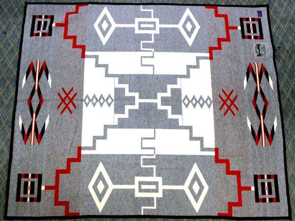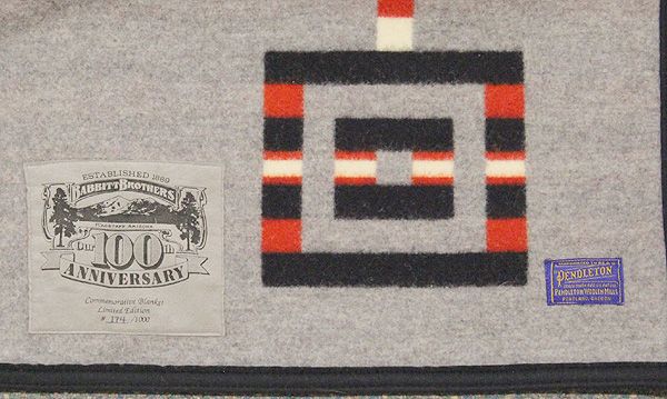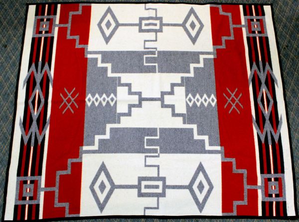 New Pendleton Wool Robe. Design is ''Storm'' Pattern. Vibrant Color in red, black, grey and off white. Measures 82''L x 64''W. Sewn in Blue Pendleton label and is a Babbitt Brothers 100th Anniversary Limited edition marked 174/1000.