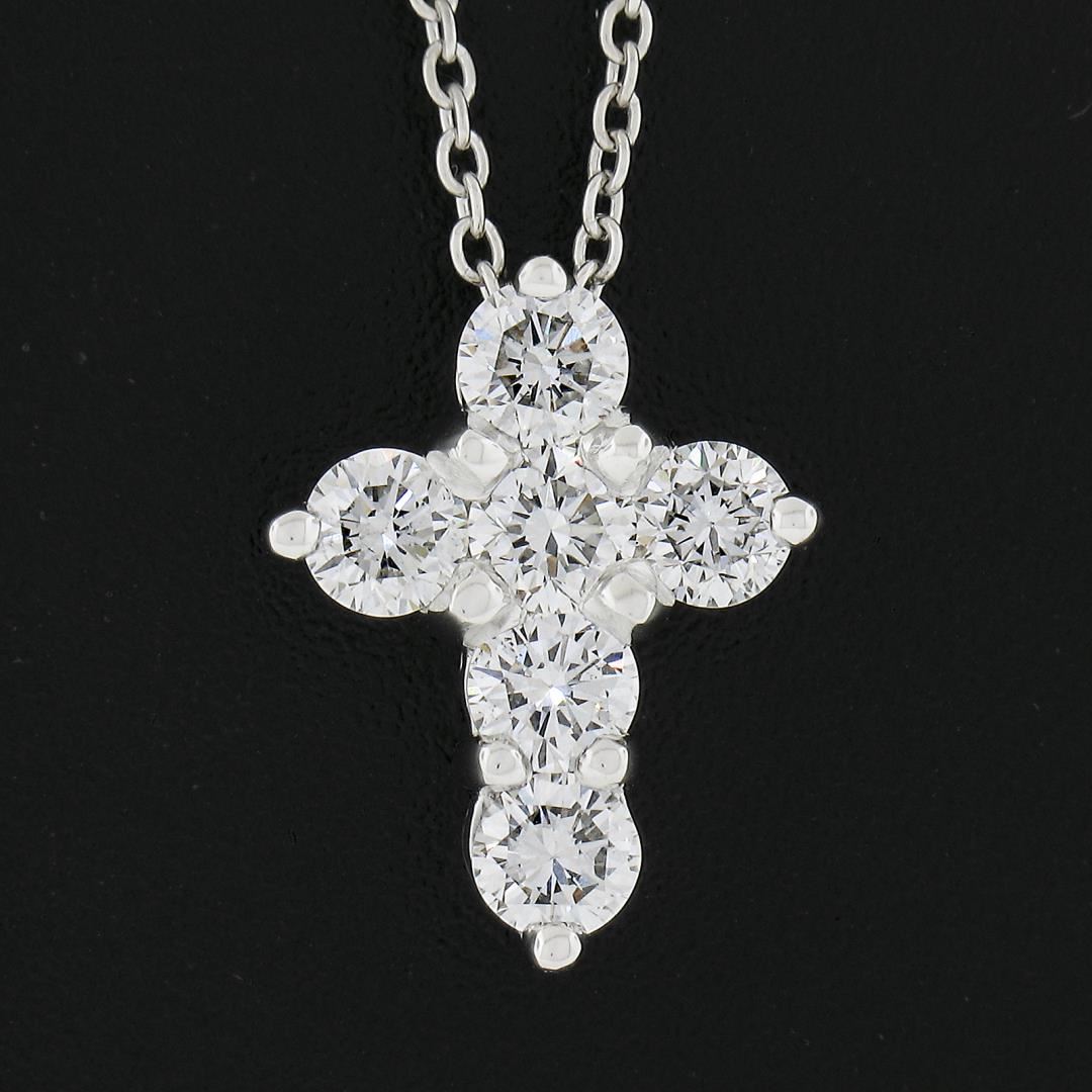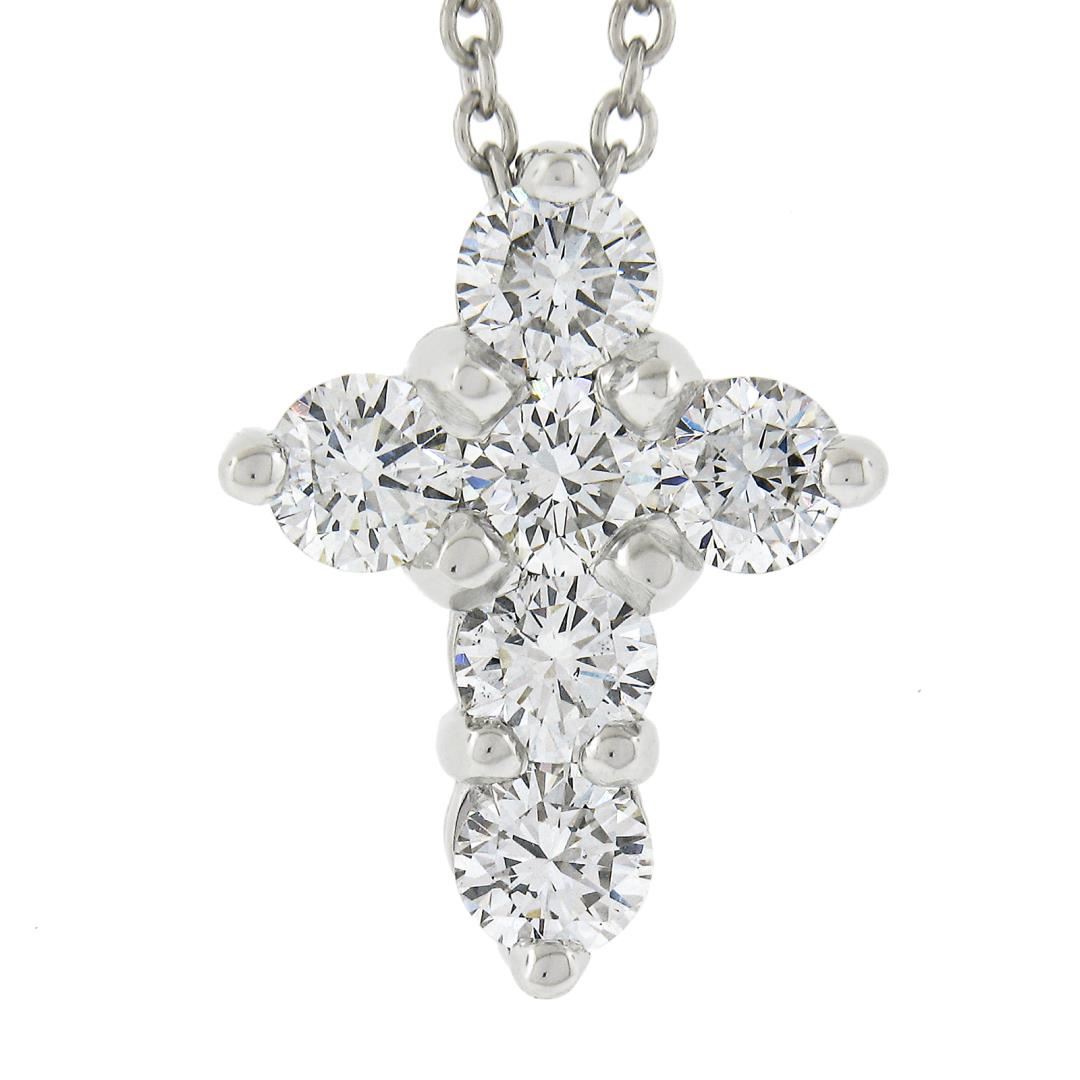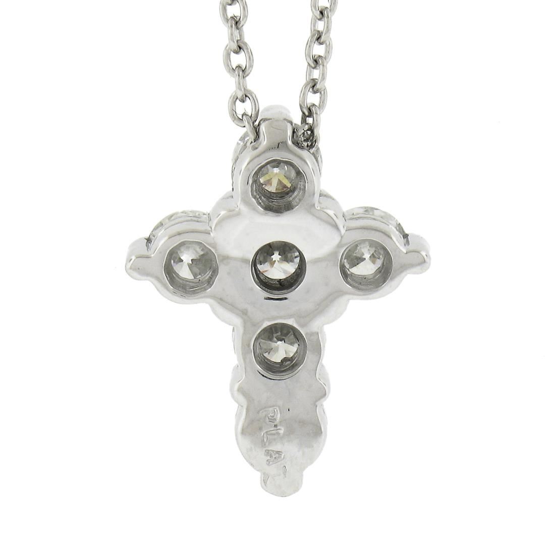 A new solid platinum cross pendant necklace, with round cut natural diamonds (F/G - VS1-SI1 ; 1.53ctw). Adjustable 16 & 18 inch cable link chain, 8.66 grams total weight, pendant measures 17.1x13.5mm.