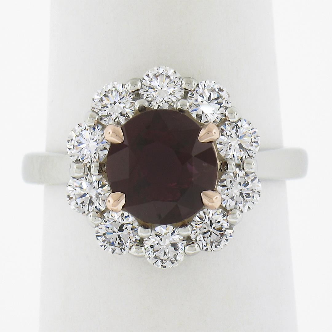 A new solid platinum & 14k rose gold ring, with 1 GIA graded round cut natural ruby (2.01ct), surrounded with a halo of 10 round cut natural diamonds (F/G - VS1/VS2 ; 1.06ctw). The ring is size 6.5, weighs a total of 6.6 grams, and measures 13.5mm wide.