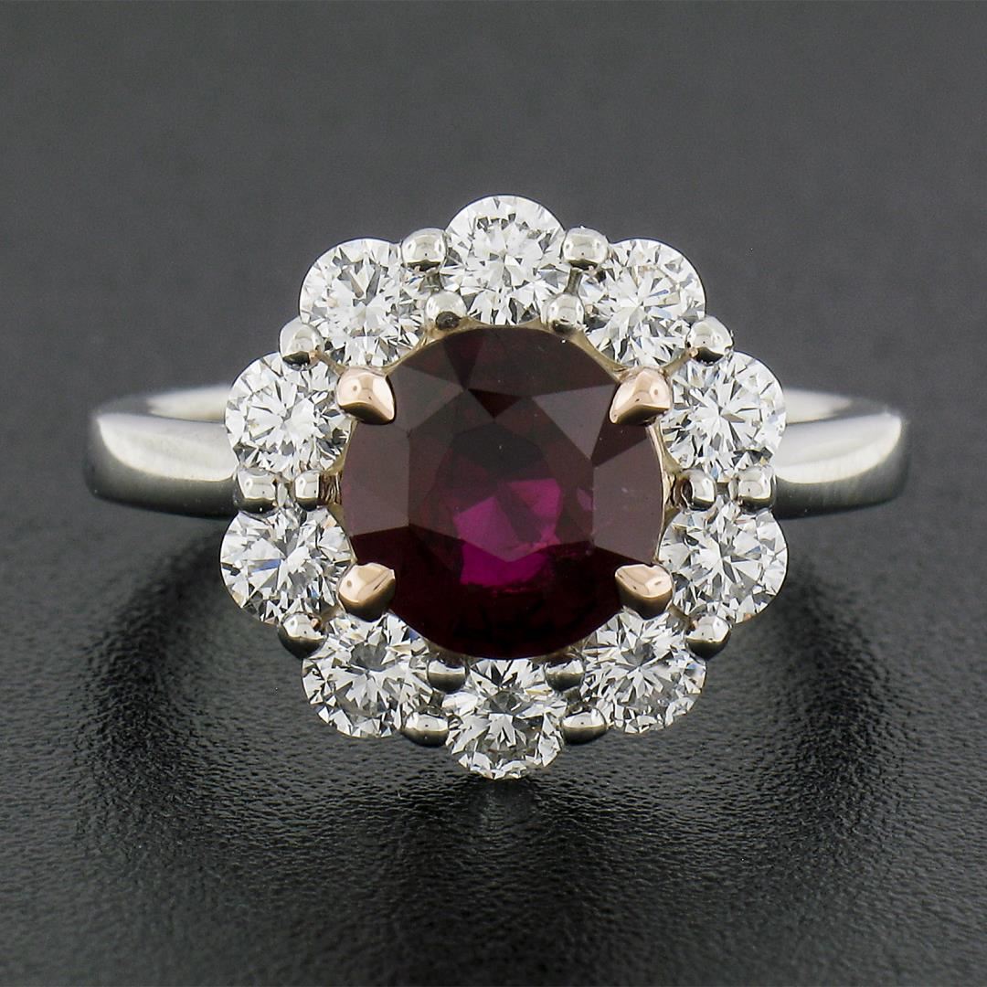 A new solid platinum & 14k rose gold ring, with 1 GIA graded round cut natural ruby (2.01ct), surrounded with a halo of 10 round cut natural diamonds (F/G - VS1/VS2 ; 1.06ctw). The ring is size 6.5, weighs a total of 6.6 grams, and measures 13.5mm wide.