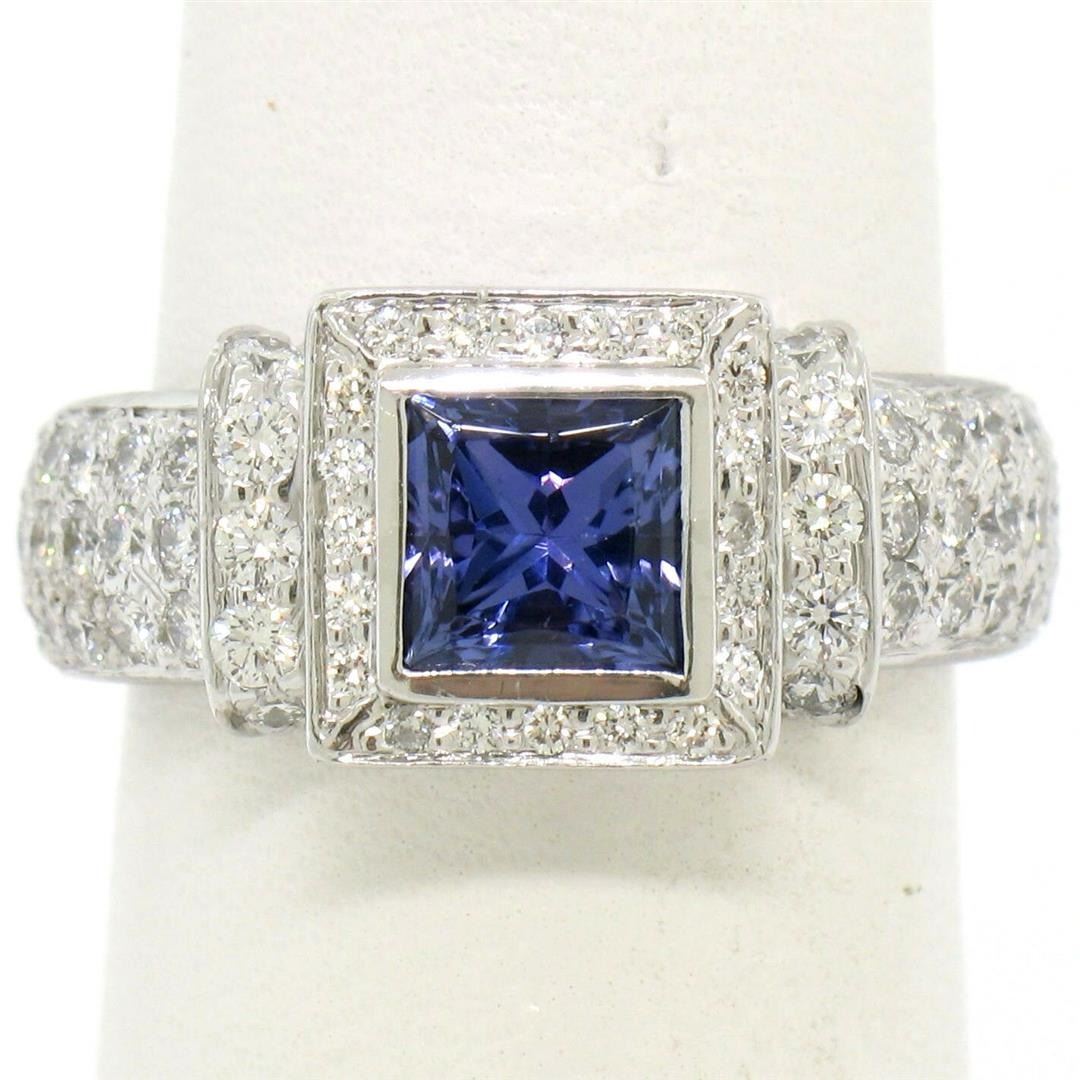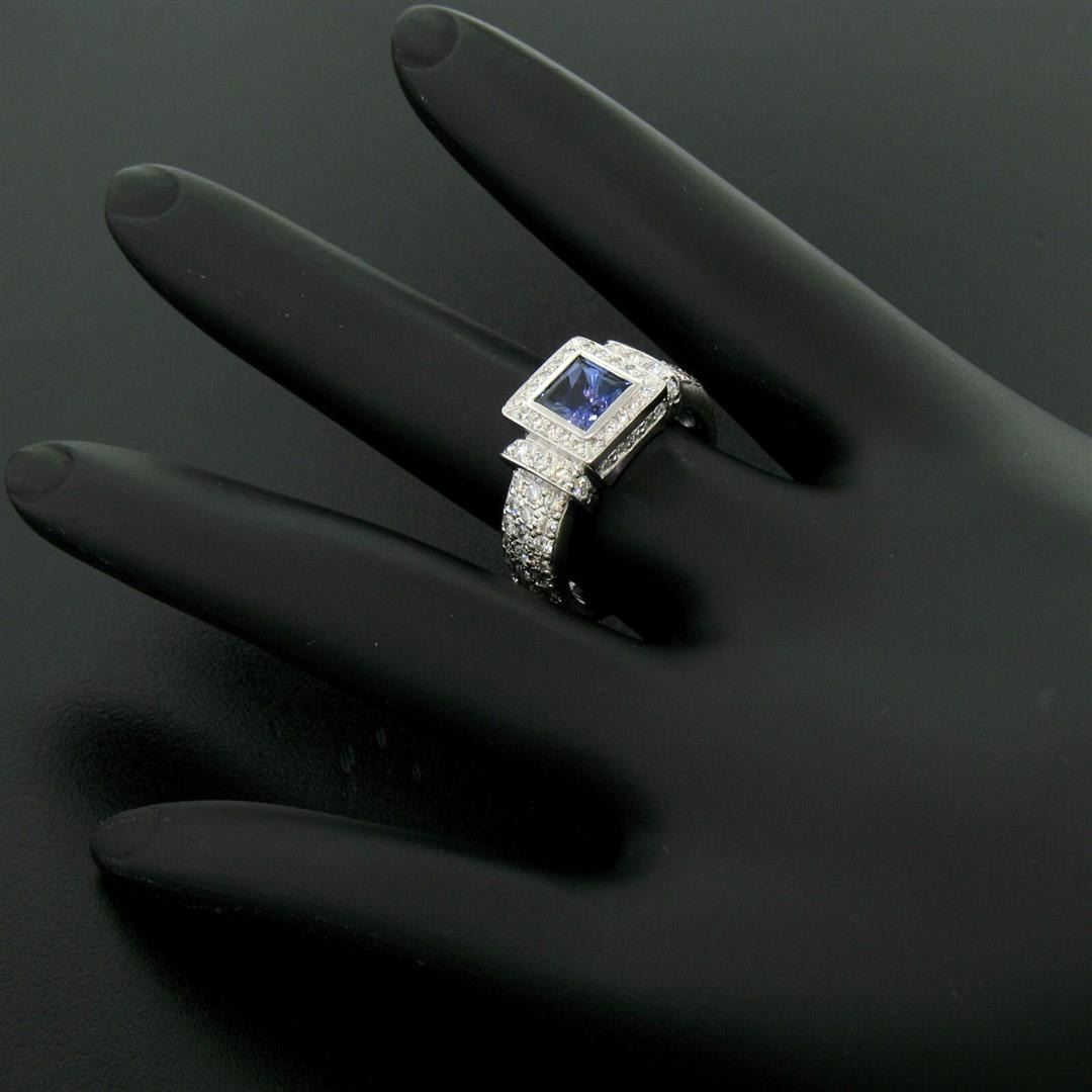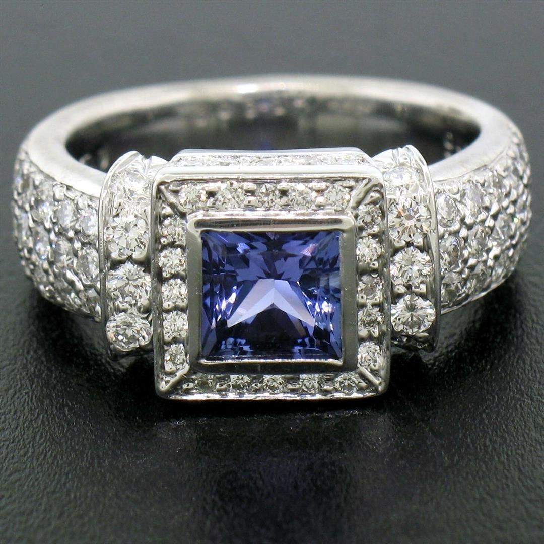 A new solid .950 platinum ring featuring a 1.15ct princess cut tanzanite accented by 1.22ctw of round brilliant diamonds (F/G - VS1). The ring is size 6.0, weighs a total of 12.17 grams, and measures 9.25mm wide.