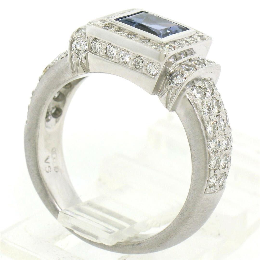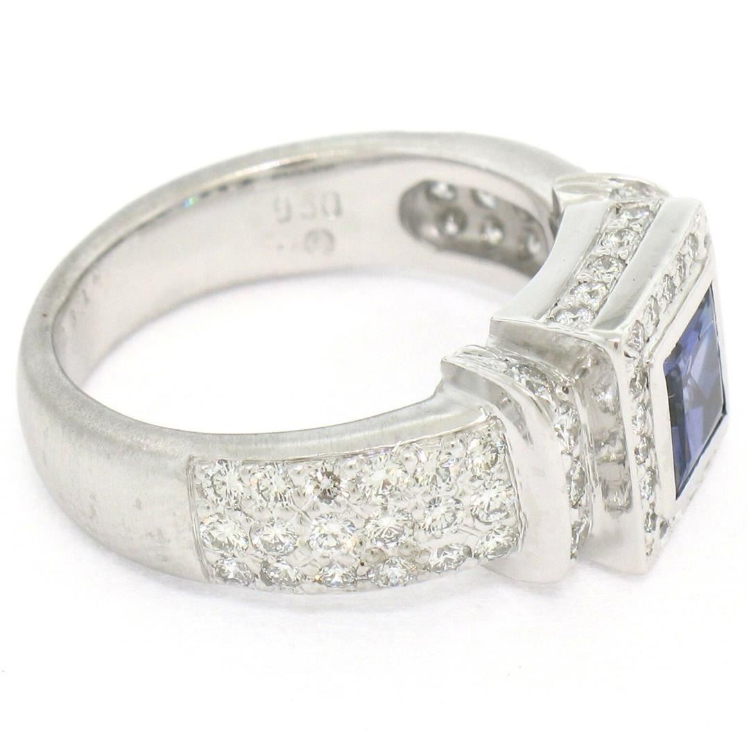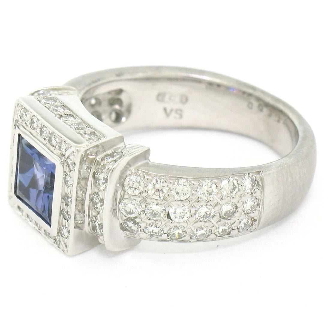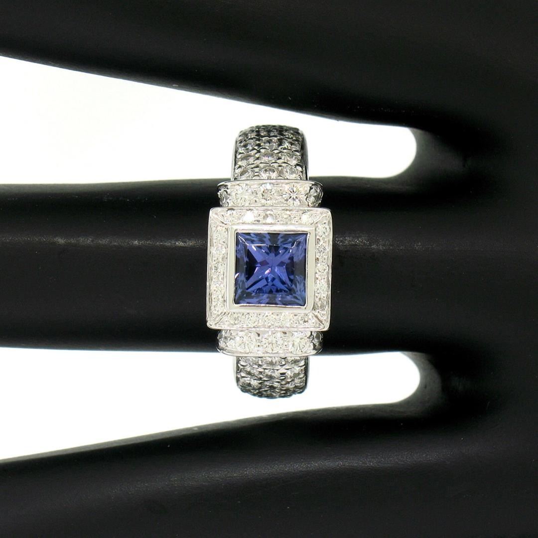 A new solid .950 platinum ring featuring a 1.15ct princess cut tanzanite accented by 1.22ctw of round brilliant diamonds (F/G - VS1). The ring is size 6.0, weighs a total of 12.17 grams, and measures 9.25mm wide.