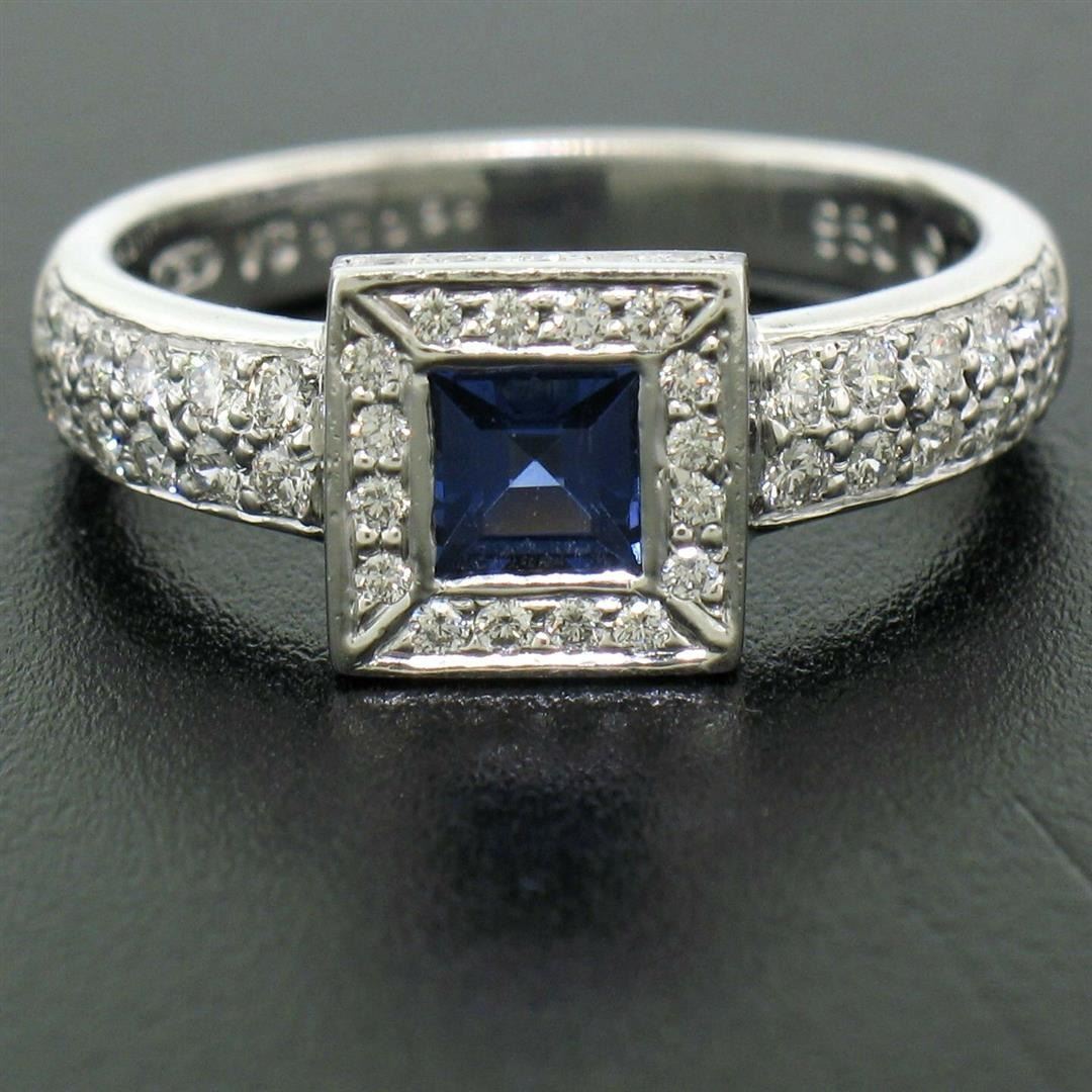 A new solid .950 platinum engagement ring featuring a bezel set square step cut sapphire accented by round brilliant cut diamonds (F/G - VS1). The ring is size 6.5, weighs a total of 6.77 grams, and measures 8.05mm wide.