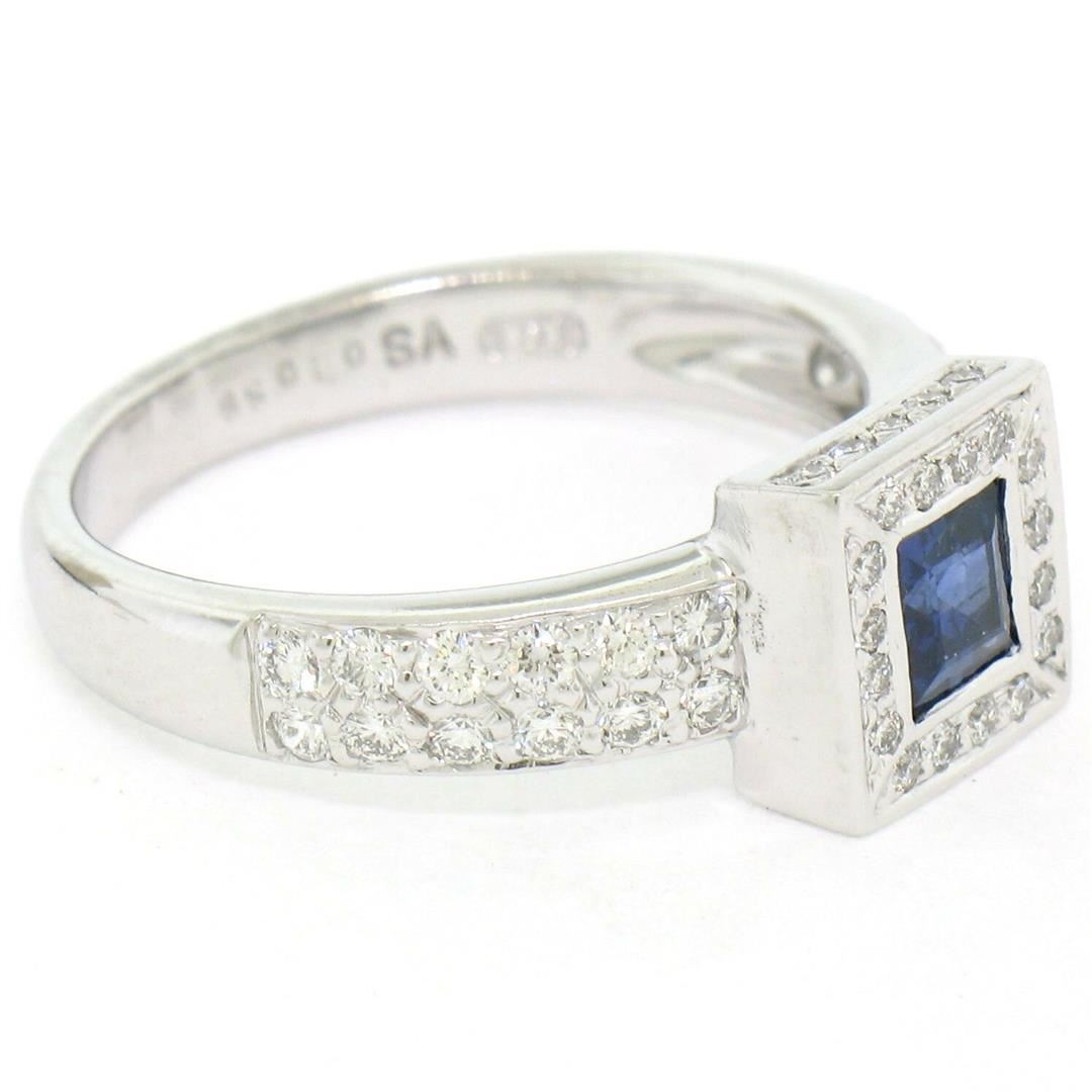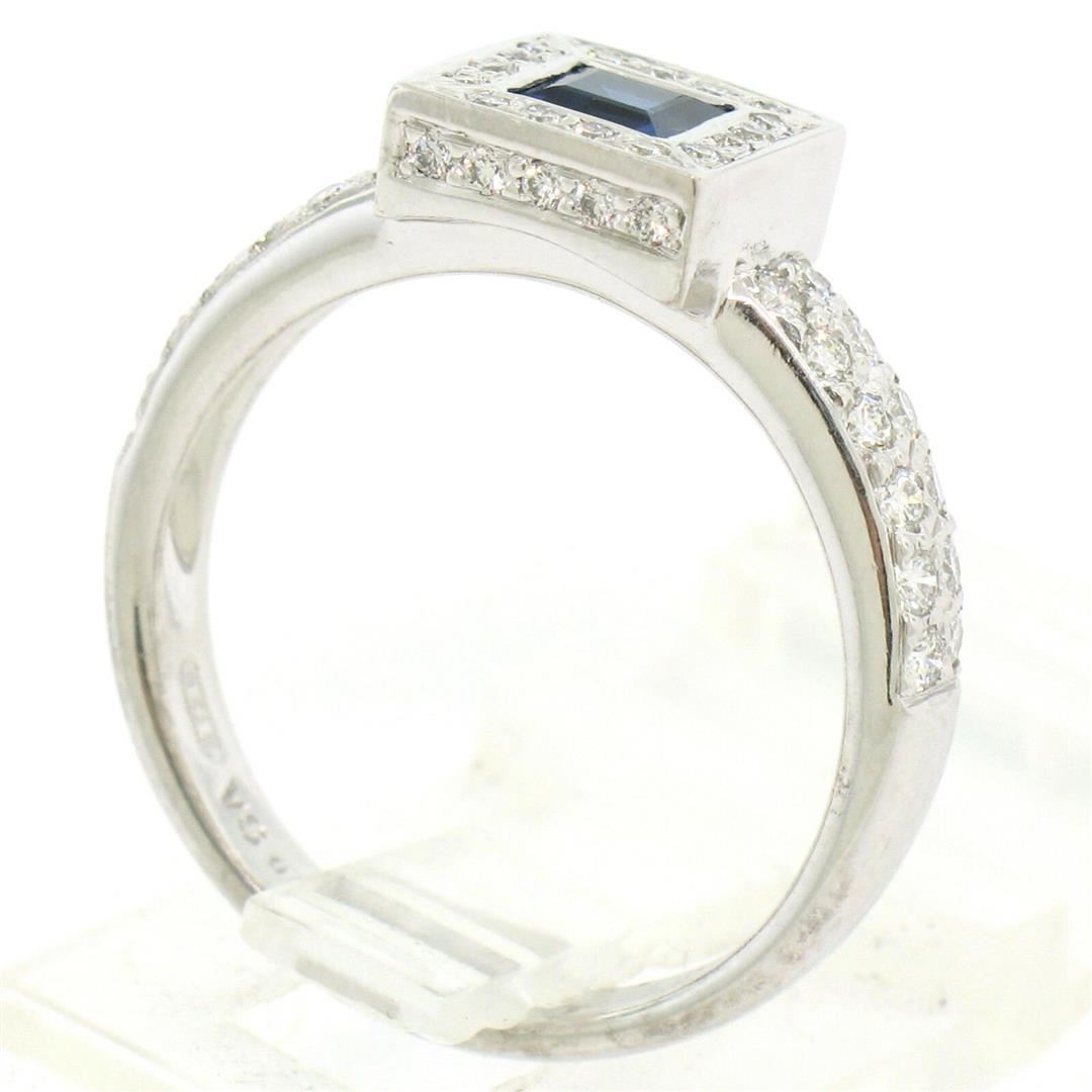 A new solid .950 platinum engagement ring featuring a bezel set square step cut sapphire accented by round brilliant cut diamonds (F/G - VS1). The ring is size 6.5, weighs a total of 6.77 grams, and measures 8.05mm wide.