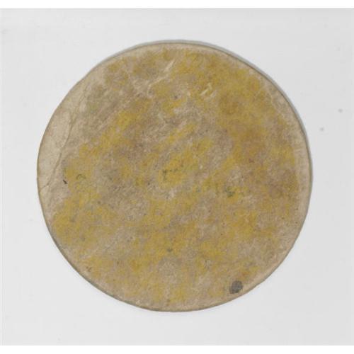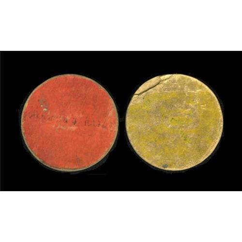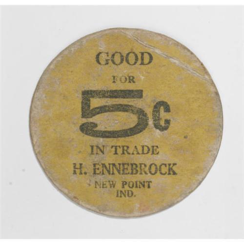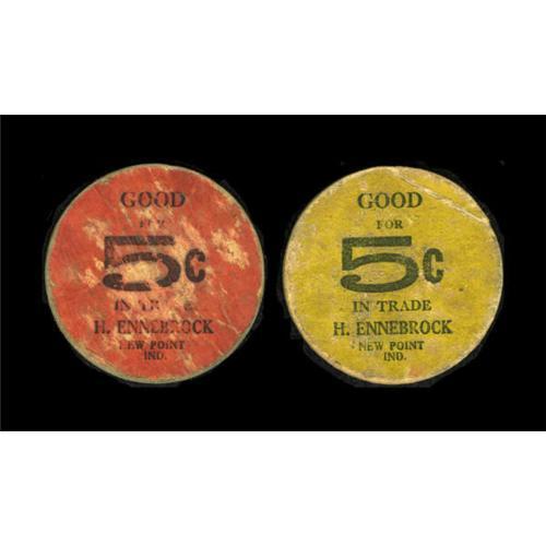 <B>New Point, IN- H. Ennebrock</B></I> 5¢ (2) Undated <BR> This lot contains two pieces of uniface 5¢ merchant scrip with one in yellow and the other one in red cardboard. They are roughly the size of silver dollars. Some scraping is noticed while the top of the yellow 5¢ has a small area of missing cardboard. <B>Fine.</B></I><BR><BR><b>Shipping:</b> Coins & Currency (<a target="_blank" href="http://www.heritageauctions.com/common/shipping.php">view shipping information</a>)