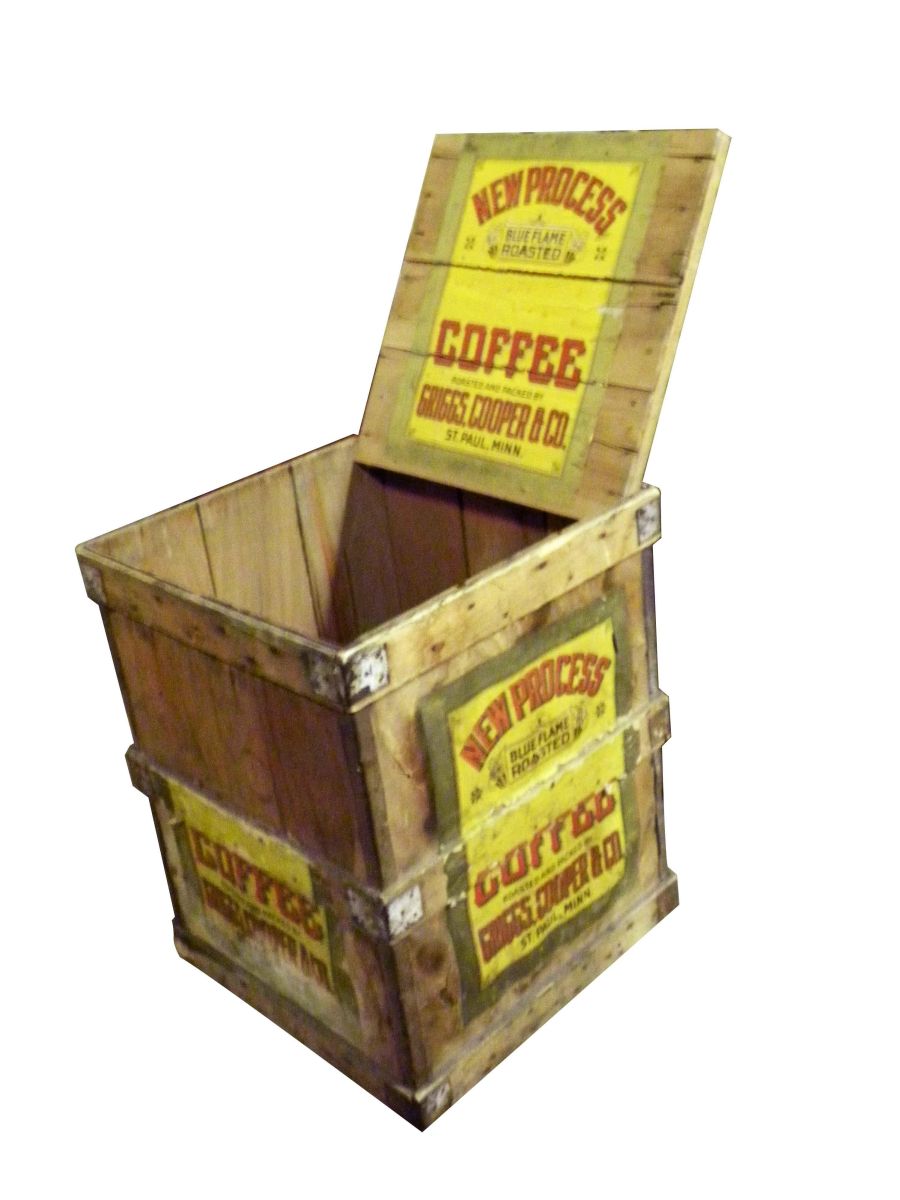 New Process Coffee Wood Store Bin w/original paper labels. Griggs, Cooper & Co. Some paper loss to some of the labels otherwise good condition. 19 X 24 X 19 inches.