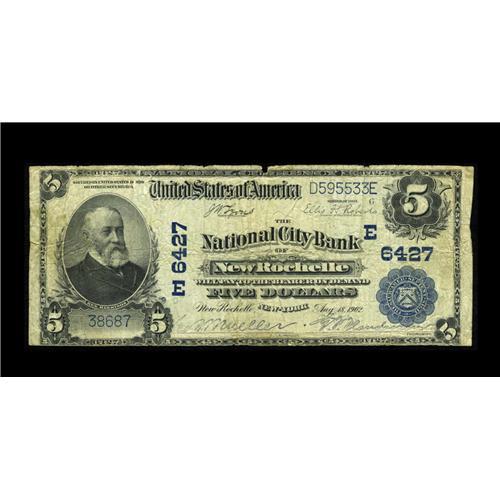 <B>New Rochelle, NY</B></I> - $5 1902 Plain Back Fr. 598 <B>The National City Bank</B></I> Ch. # (E)6427<BR>Large notes only from this Westchester County bank, which was New Rochelle's sole issuer. We sold a similar $5 on this bank in January 2006 for nearly $1000. <B>Very Good-Fine,</B></I> with one small chip out of the top margin.<BR><BR><b>Shipping:</b> Coin/Currency (<a target="_blank" href="http://www.heritageauctions.com/common/shipping.php">view shipping information</a>)