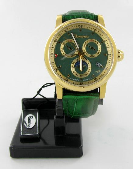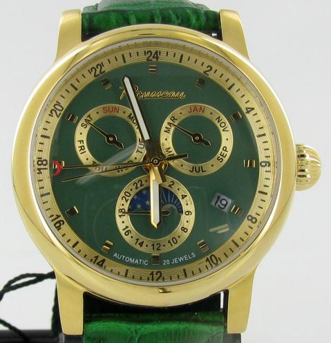 Brand New men's stylish sport CHRONOGRAPH style watch in excellent new condition with moon phase, day, date and weekday dials; stainless oversized gold tone case and green leather band; box and papers; retail $2495