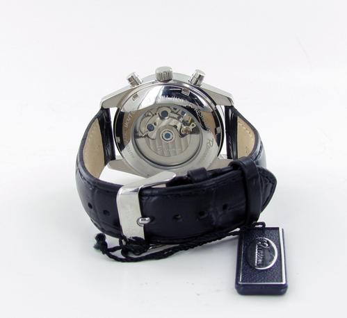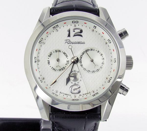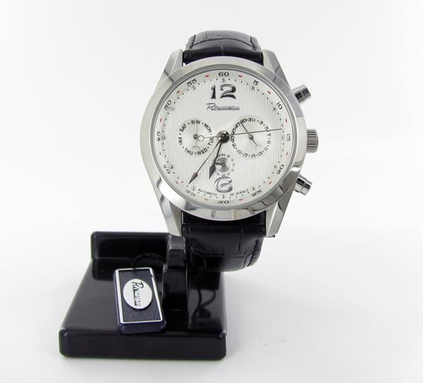 Brand New Rousseau men's stainless & leather sport style skeleton watch in excellent new condition with day and date dials; and box; retail $1695