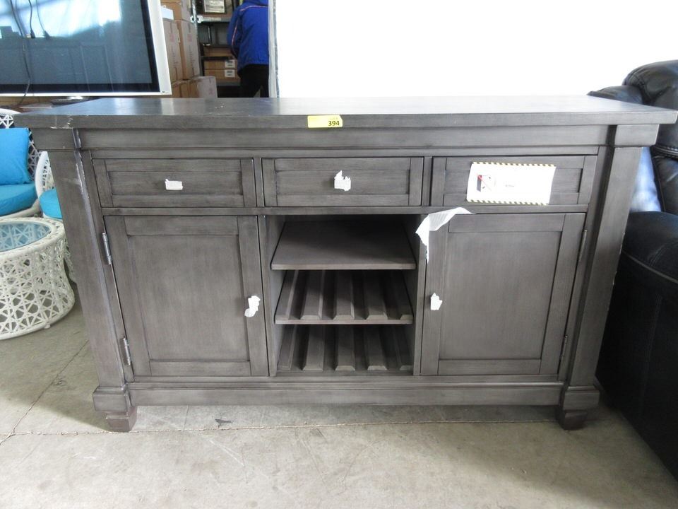 3 drawers and 2 doors. Small shipping scuff on the front. 18" x 58" x 36" tall.