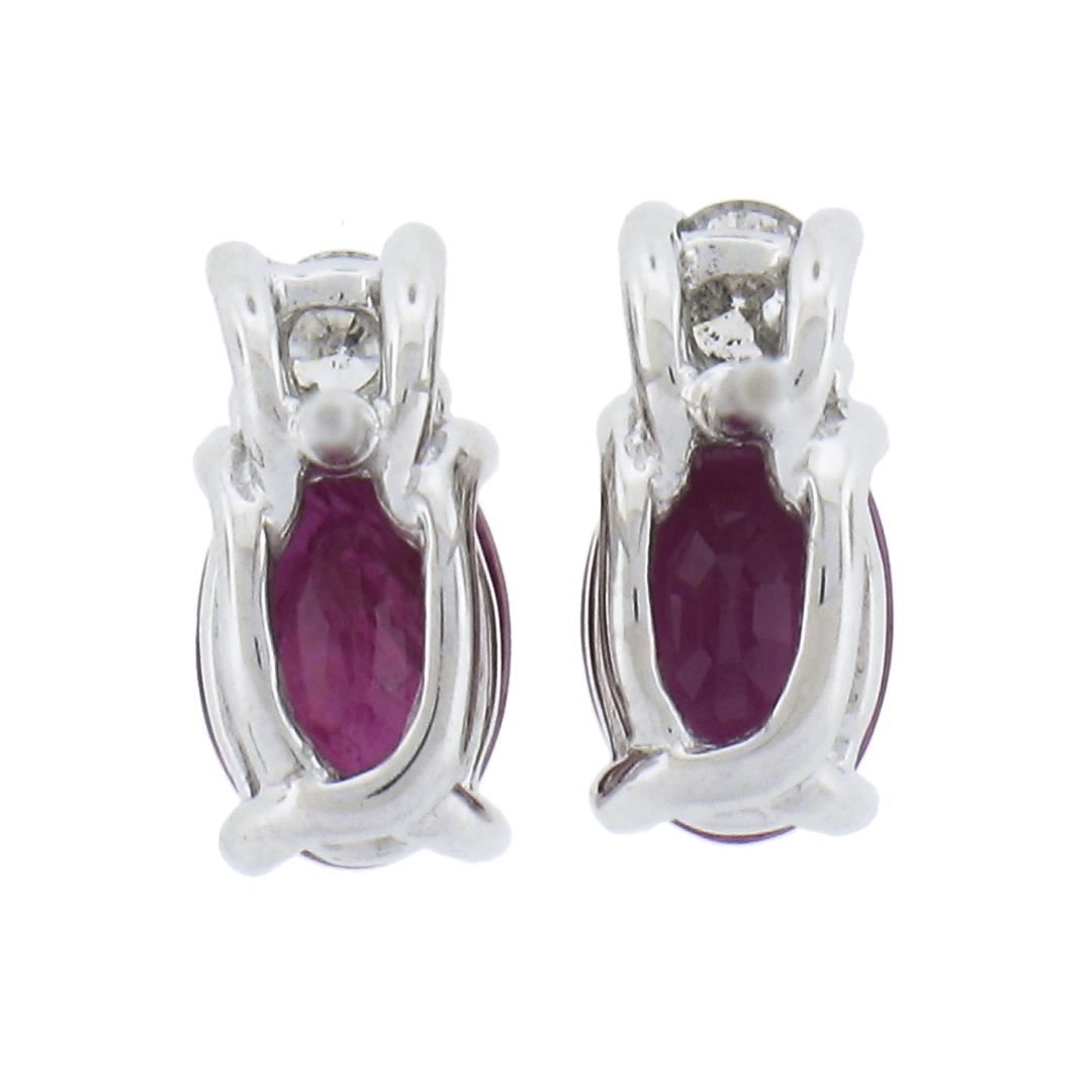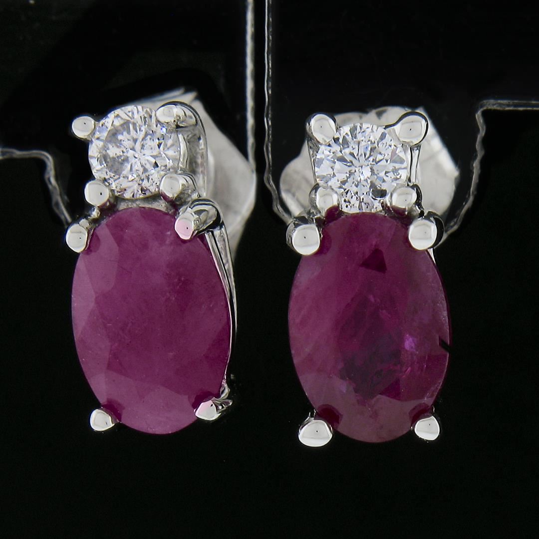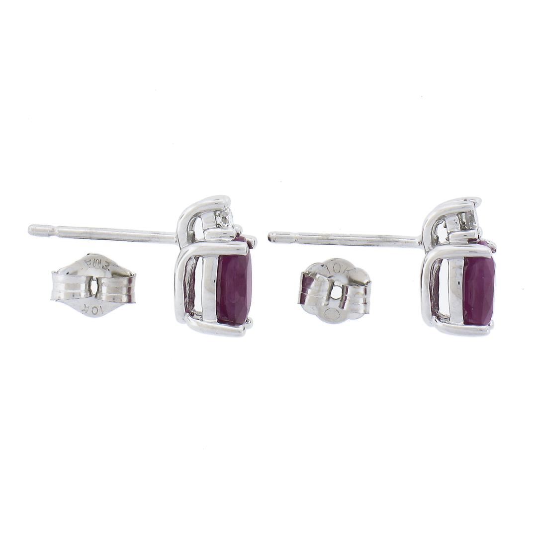 A new solid 10k white gold stud earrings, with 2 oval cut natural ruby (1.20ctw), and 2 round cut natural diamonds (G/H - SI1/SI2 ; 0.10ctw). The earrings measure approximately 8.7x4.1mm and weigh a total of 1.2 grams.
