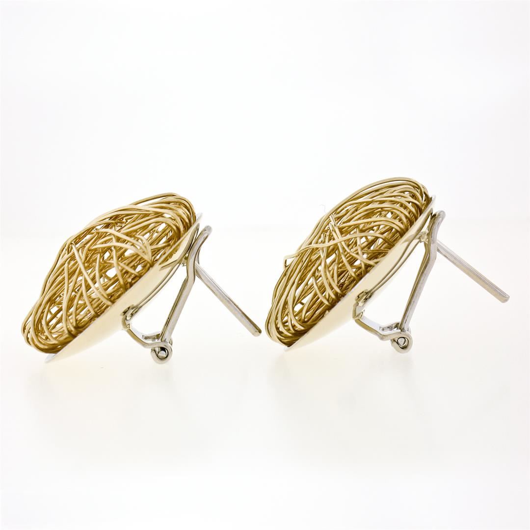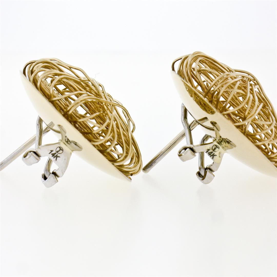 A new solid 14k yellow gold large round tangled wire button earrings, The earrings measure approximately 23.0mm in diameter and weigh a total of 10.19 grams.