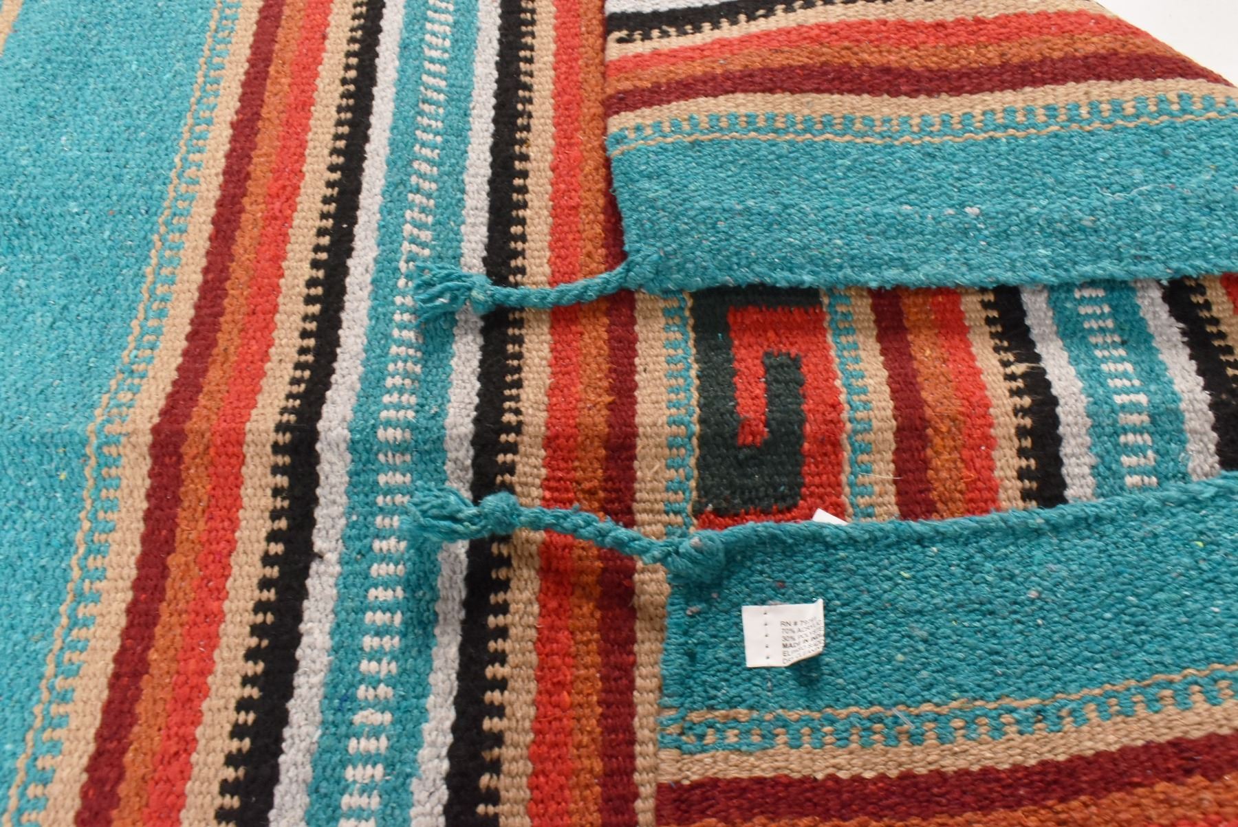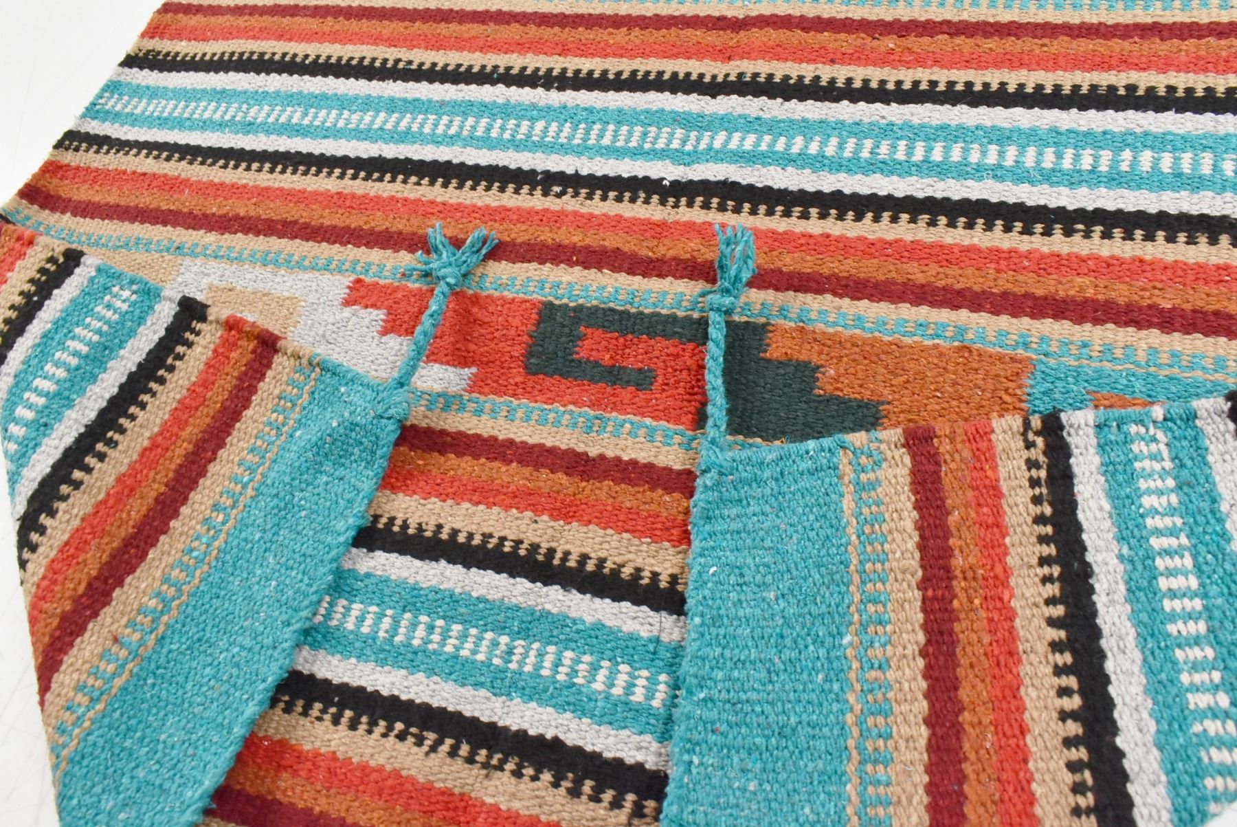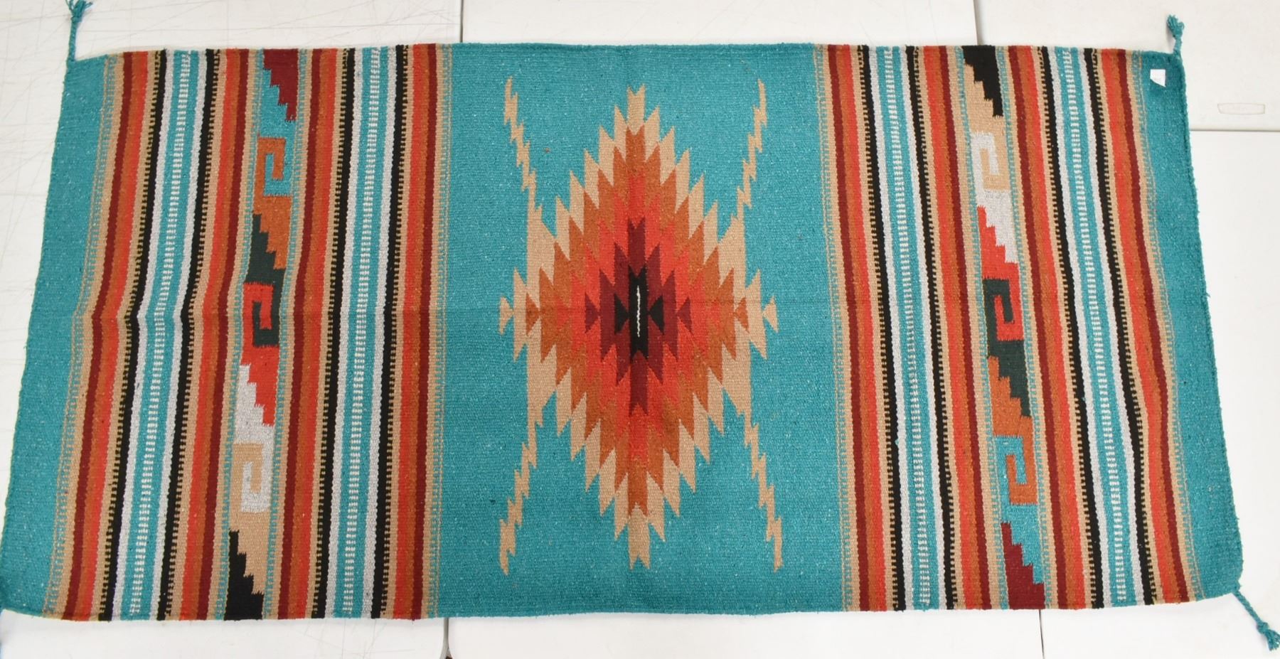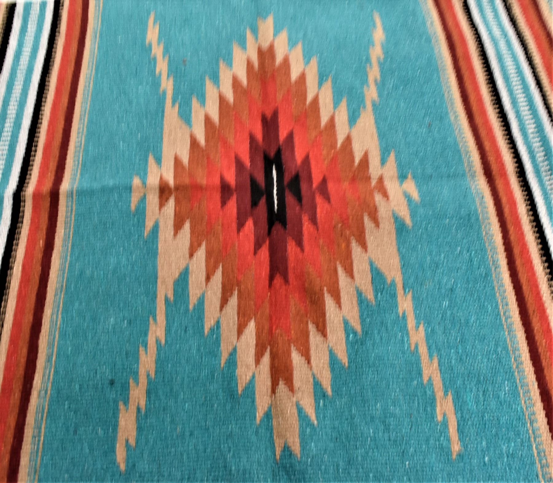 New Southwestern Rug, measures 32'' x 64'', gorgeous colors, 70% Acrylic and 30% Polyester, made in India for El Paso Saddleblanket, it is recommended that it be dry cleaned