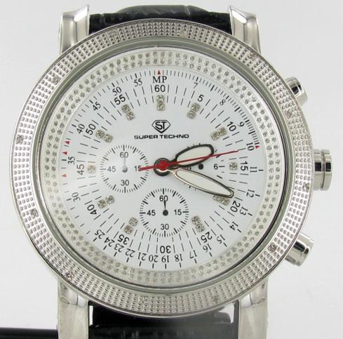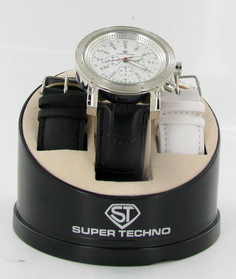 Brand Techno Com men's stylish chrono style watch with diamonds mounted in bezel; excellent new condition with 2 tachy dials and 24 hour dial; stainless case and 3 leather bands; box and papers; retail $2595
