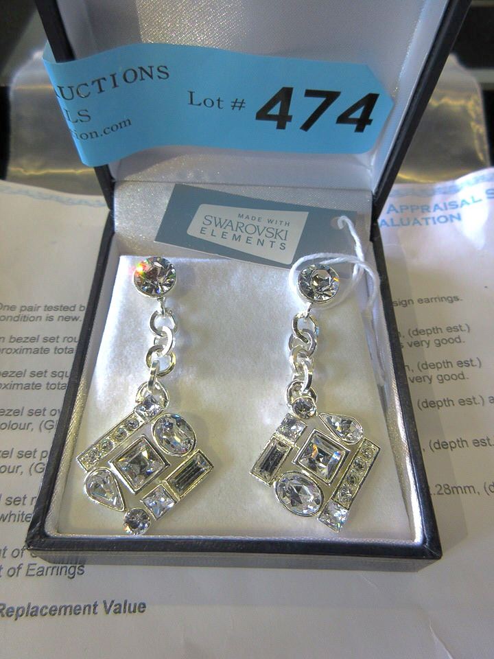 Post and Butterfly Back. 23 Swarovski Elements Crystals. White Gold Plated. 2 " Long. Has a certificate of evaluation.