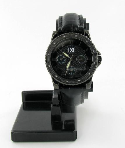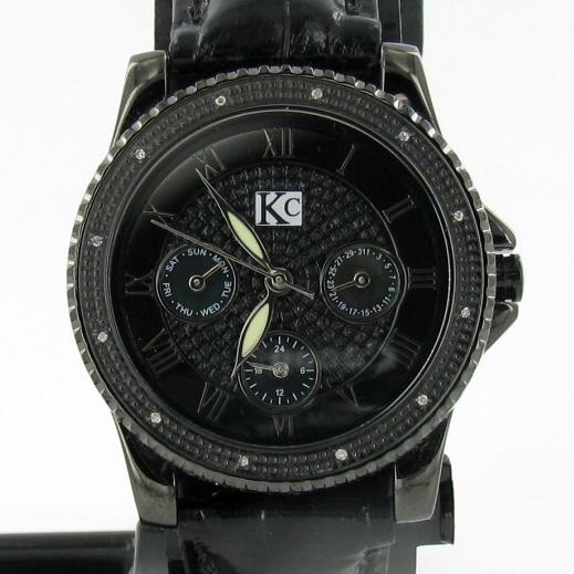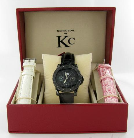 Brand Techno Com ladies's stylish sport style watch with diamonds mounted in bezel; excellent new condition with black stainless case and 3 leather bands; box and papers; retail $2295