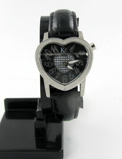 Brand Techno Com ladies's stylish sport style watch with diamonds mounted in bezel and heart-shaped face; excellent new condition with stainless case and leather band; box and papers; retail $2495