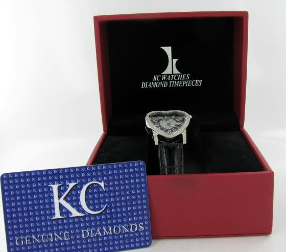 Brand Techno Com ladies's stylish sport style watch with diamonds mounted in bezel and heart-shaped face; excellent new condition with stainless case and leather band; box and papers; retail $2495