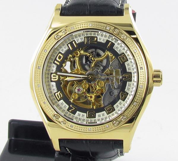 Brand Techno Com men's stylish sport style skeleton watch with diamonds mounted in bezel ; excellent new condition with gold tone stainless case and 3 leather bands; box and papers; retail $2845