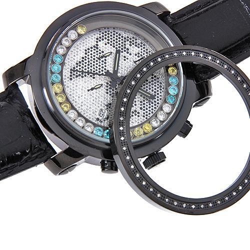 Brand Techno Com men's stylish sport style watch with diamonds mounted in bezel; excellent new condition with black stainless case and leather band; box and papers; retail $2795