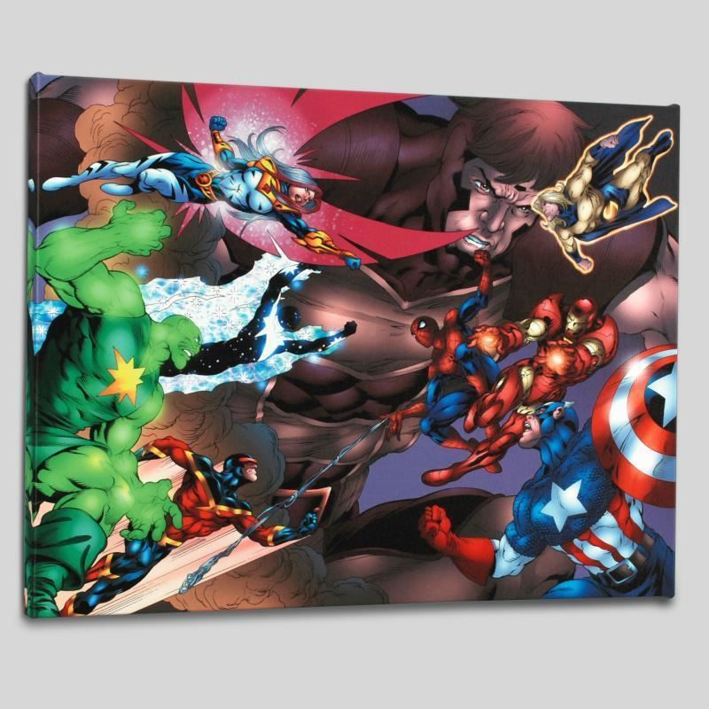 A piece of comic book history, this limited edition, from original art by Tom Grummett, depicts an action-packed scene featuring the Avengers. While working for Marvel, Tom Grummett was the penciller on the Thunderbolts series and also co-created the X-Men Forever series. "New Thunderbolts #13" is a limited edition numbered giclee on stretched canvas by Tom Grummett presented by Marvel Comics. This piece comes gallery wrapped. Includes Certificate of Authenticity! Measures approx. 24" x 18" (image); 1.5" (depth).
