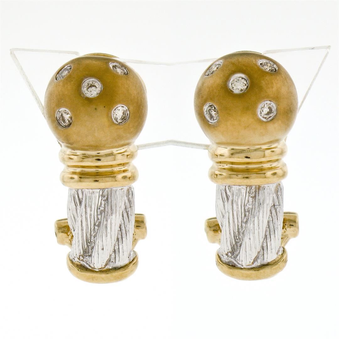 New Unique 14K TT Gold .20ctw Round Diamond Textured Brushed Omega Back Earrings. Please see photos and description for all available information. a new solid 14k yellow and white gold brushed earrings, with 10 round brilliant cut natural diamonds (G/H- VS2; 0.20ctw). The earrings measure approximately 20.0x8.85mm and weigh a total of 6.43 grams.