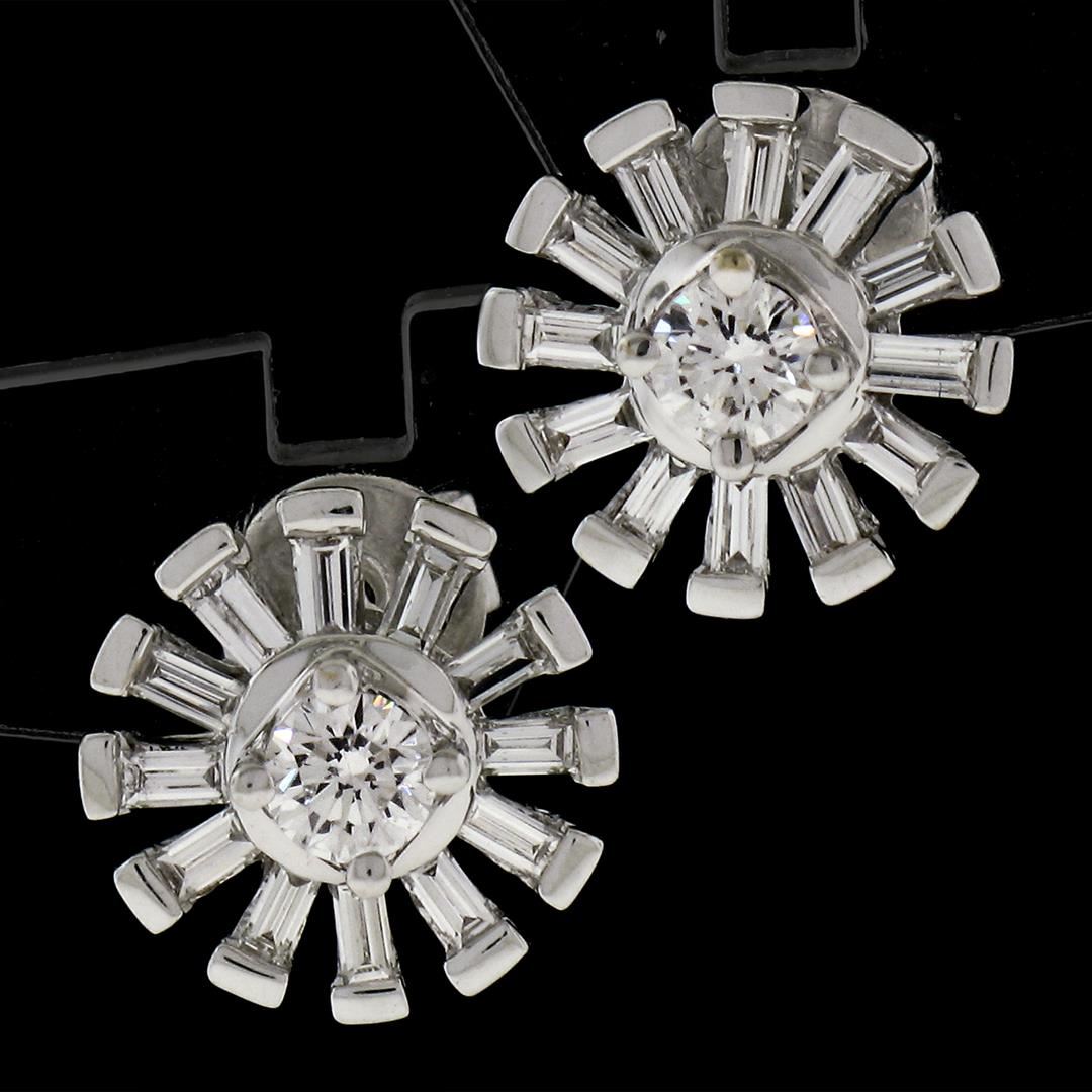 A New pair of solid 18k white gold snowflake stud earrings, with 2 round brilliant cut natural diamonds (F/G - VS2 ; 0.24ctw), surrounded with 24 baguette cut natural diamonds (F/G - VS1 ; 0.78ctw). The earrings measure approximately 10.10mm in diameter and weigh a total of 3.56 grams.