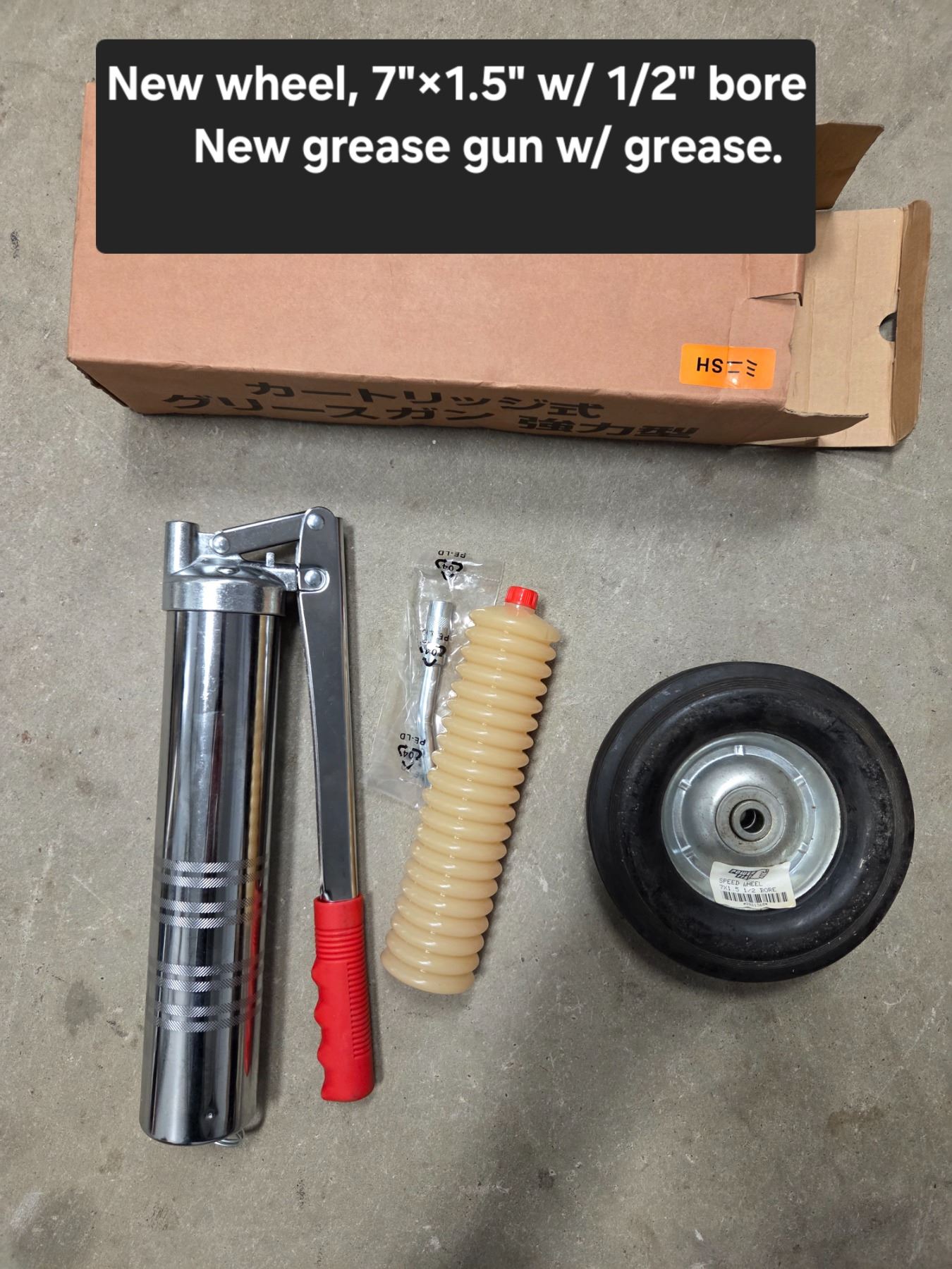 New Wheel 7"x1.5" w/ 1/2" bore New Grease Gun w/ Grease