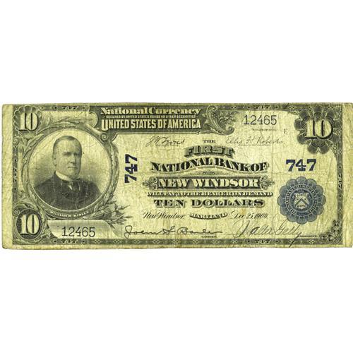 <B>New Windsor, MD</B></I> - $10 1902 Plain Back Fr. 624 <B>The First NB</B></I> Ch. # 747<BR>A handful of survivors are known from this institution, though the average grade is actually quite low, with no known uncirculated specimens. This note, which is a moderately circulated <B>Very Good-Fine,</B></I> with no paper problems whatsoever. The signatures here remain bold, which may not be the case on the other known survivors.
