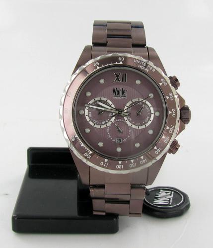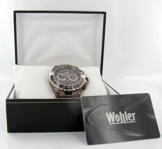 Brand New Wohler men's stylish sport CHRONOGRAPH style watch in excellent new condition with date, 24-hour, weekday and month dials; stainless bronze IP case and band; box and papers; retail $2295