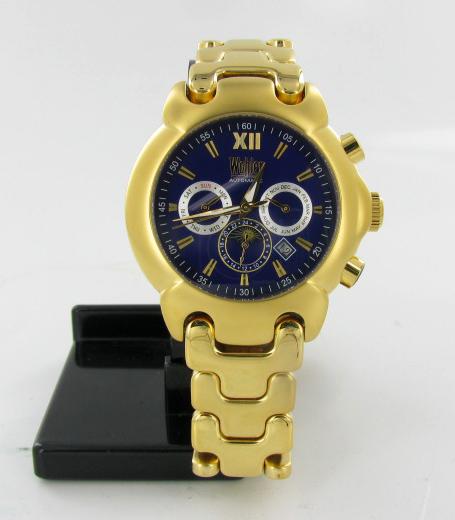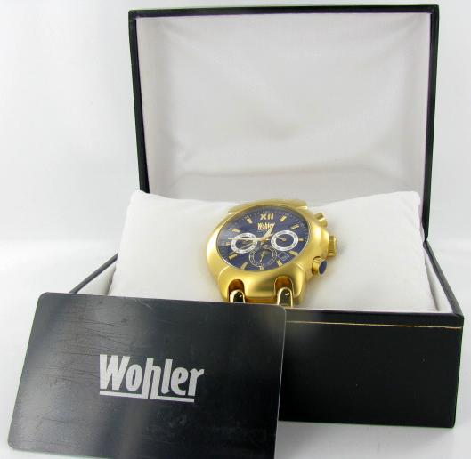 Brand New Wohler men's stylish sport CHRONOGRAPH function watch in excellent new condition with date, 24-hour, weekday and month dials; stainless gold tone case and band; box and papers; retail $2495