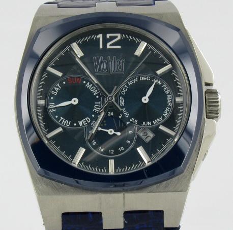 Brand New Wohler men's stylish sport CHRONOGRAPH style watch in excellent new condition with date, 24-hour, weekday and seconds dials; stainless case, blue ceramic bezel and leather band; box and papers; retail $2295
