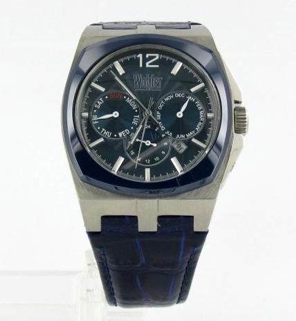 Brand New Wohler men's stylish sport CHRONOGRAPH style watch in excellent new condition with date, 24-hour, weekday and seconds dials; stainless case, blue ceramic bezel and leather band; box and papers; retail $2295