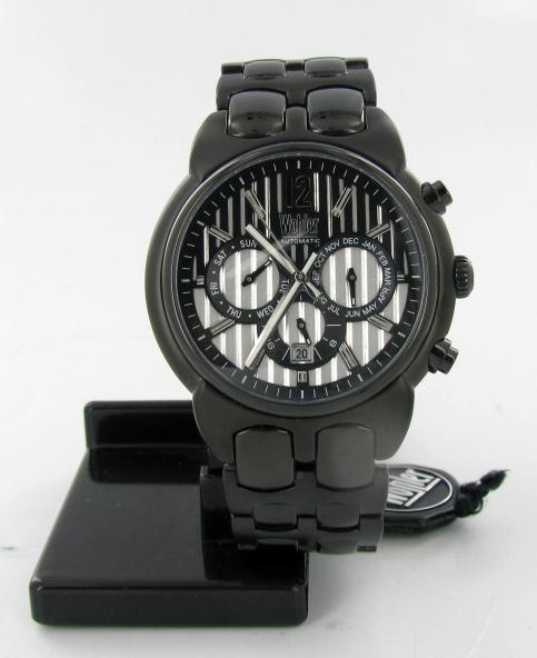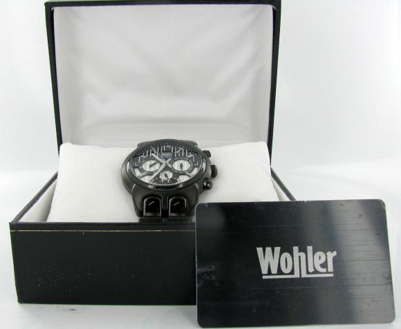 Brand New Wohler men's stylish sport CHRONOGRAPH style watch in excellent new condition with date, 24-hour, weekday and month dials; stainless black IP case and band; box and papers; retail $2295