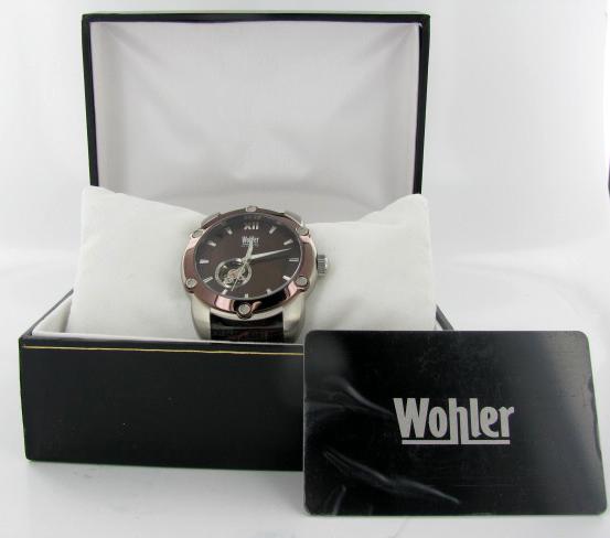 Brand New Wohler men's stylish sport style watch in excellent new condition with seconds dial; stainless case and leather band; box and papers; retail $1695