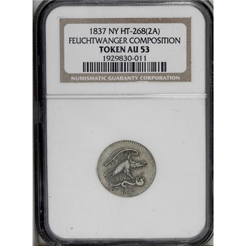 <B>New York 1837 NY Low 120, HT-268(2A), R.5, Feuchtwanger Composition, AU53 NGC.</B></I> The 18 in the date is low, with the 37 much larger and higher. The eagle has eight tailfeathers, five of which touch the ground. About 30 degrees of clockwise die rotation is noted on this medium silver-gray example. This is one of the scarcer die varieties of the Low 120 Feuchtwanger tokens.<BR><I>From The Troy Wiseman Collection.</B></I>