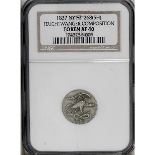 <B>New York 1837 NY Low 120, HT-268(5H), R.1, Feuchtwanger Composition, XF40 NGC.</B></I> Moderate wear shows over each side. Some minimal planchet roughness shows on the reverse side.<BR><I>From The Troy Wiseman Collection.</B></I>