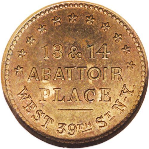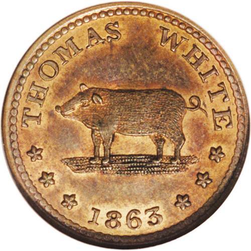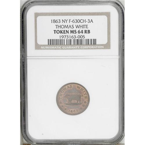 <B>1863 Thomas White, Fuld-NY-630CH-3a, R.2, New York, NY, MS64 NGC.</B></I> A nice Civil War token with a boar depicted on the obverse. This token has plenty of remaining luster. Mr. White was located at 13 & 14 Abattoir Place in New York City. A pig is shown at the center of the obverse<BR><I>From The Troy Wiseman Collection.</B></I>