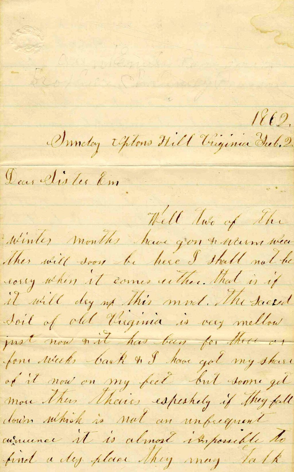 Letter from Charles E. Persons of the 24th New York Infantry, Company K. Written in ink and datelined ''Sunday Uptons Hill, Virginia / Feb 2 1862,'' letter reads in part: ''...Well two of the winter months have gone and warm weather will soon be here. I shall not be sorry when it comes either, that is, if it will dry up this mud. The sacred soil of old Virginia is very mellow just now and it has been for three or four weeks back and I have got my share of it now on my feet but some got more then their's especially if they fall down which is not an unfrequent occurence. lt is almost impossible to find a dry place. They may talk of making an advance now as much as they want to now but it can not be done and I think that it will be some time before we can but we have got marching orders. They came last week. A week ago to day our regiment went out on picket again. We had a pretty good time this time out. lt was not very cold but the morning that we came in it rained and we had to march five miles in the rain and it froze as fast as it came so by the time we got to camp we were covered with ice. lt was very hard marching...'' Charles Persons mustered into Company K on 27 September 1861 and was transferred to Company E of the 76th New York Infantry on 13 May 1863. He was wounded at Gettysburg on 1 July 1863 and later died of his wounds on 15 July 1863. Before his death, Persons was engaged in battle at Falmouth, Rappahanock Station, Second Bull Run, South Mountain, Antietam, Fredericksburg and Chancellorsville. 3pp. letter measures 5'' x 8''. Mild fading to ink and toning to rear leaf, otherwise near fine condition.