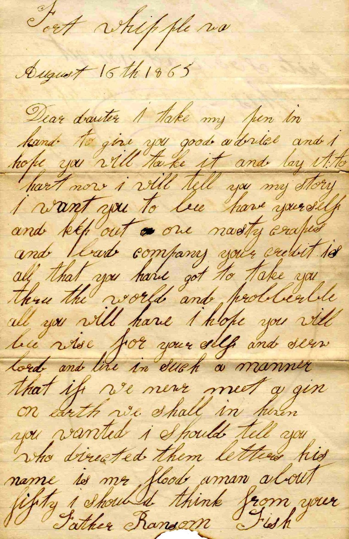ALS from Ransom Fish of the 2nd New York Heavy Artillery. Accompanied by cover. Letter, datelined 16 August 1865, Fort Whipple, Virginia, reads in part: ''...Dear dauter I take my pen in hand to give you good advice and I hope you will take it and lay it to hart...I want you to bee have yourself and kep out ov nasty scrapes and bad company your credit is all that you have got to take you thru the world and probberble all you will have. I hope you will bee wise for your self and serv the lord and live in such a manner that if we nevr meet a gin on earth we shall in heven. you wanted I should tell you who directed them letters his name is mr flood a man about fifty I should think...'' Ransom Fish mustered into service on 30 March 1864 and mustered out on 29 September 1865 at Washington, D.C. The 2nd New York Heavy Artillery saw action at North Ana, Cold Harbor, Totopotomoy, the Crater, Deep Bottom, Boydton Plank, Ream's Station and Appomattox. Single page ink letter measures 5'' x 8''. Small bite at bottom edge and very light overall soiling. Excellent condition.