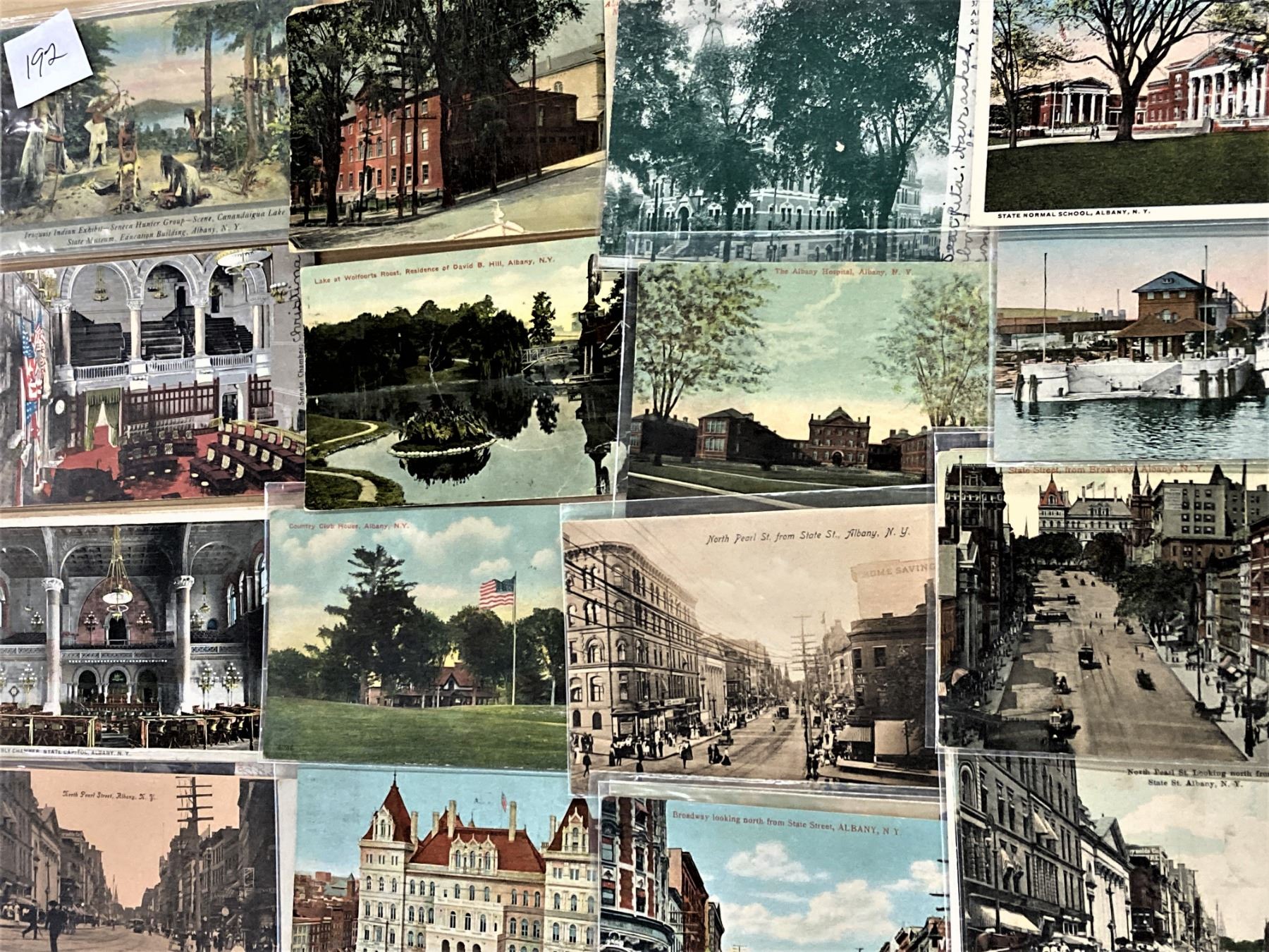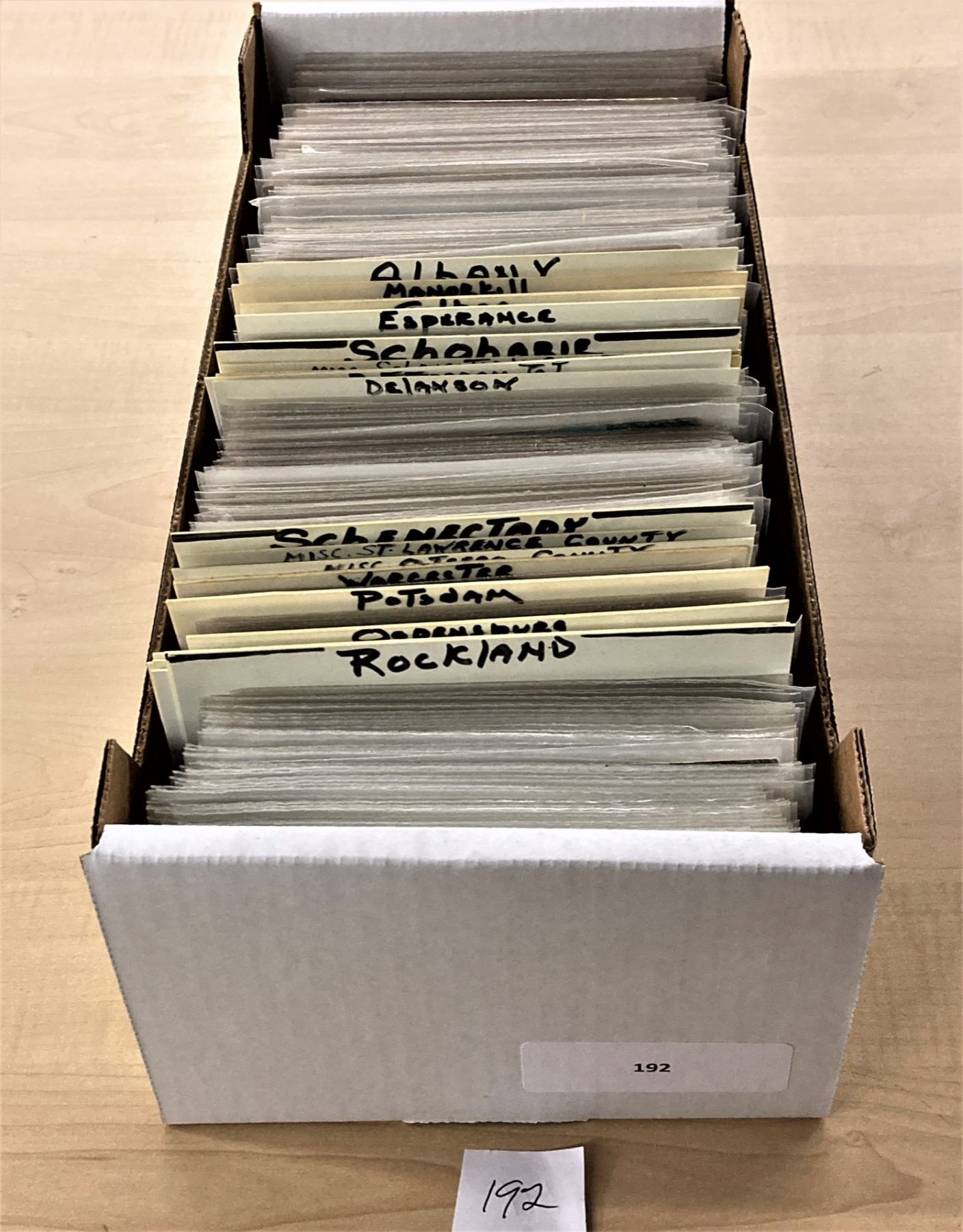 Box of New York. Many different towns and counties. Some are: Rensselear County, Massena, Pottsdam, Schnectady, Schoharie, Albany, Cobleskill, Esperance & more. Early to linen.